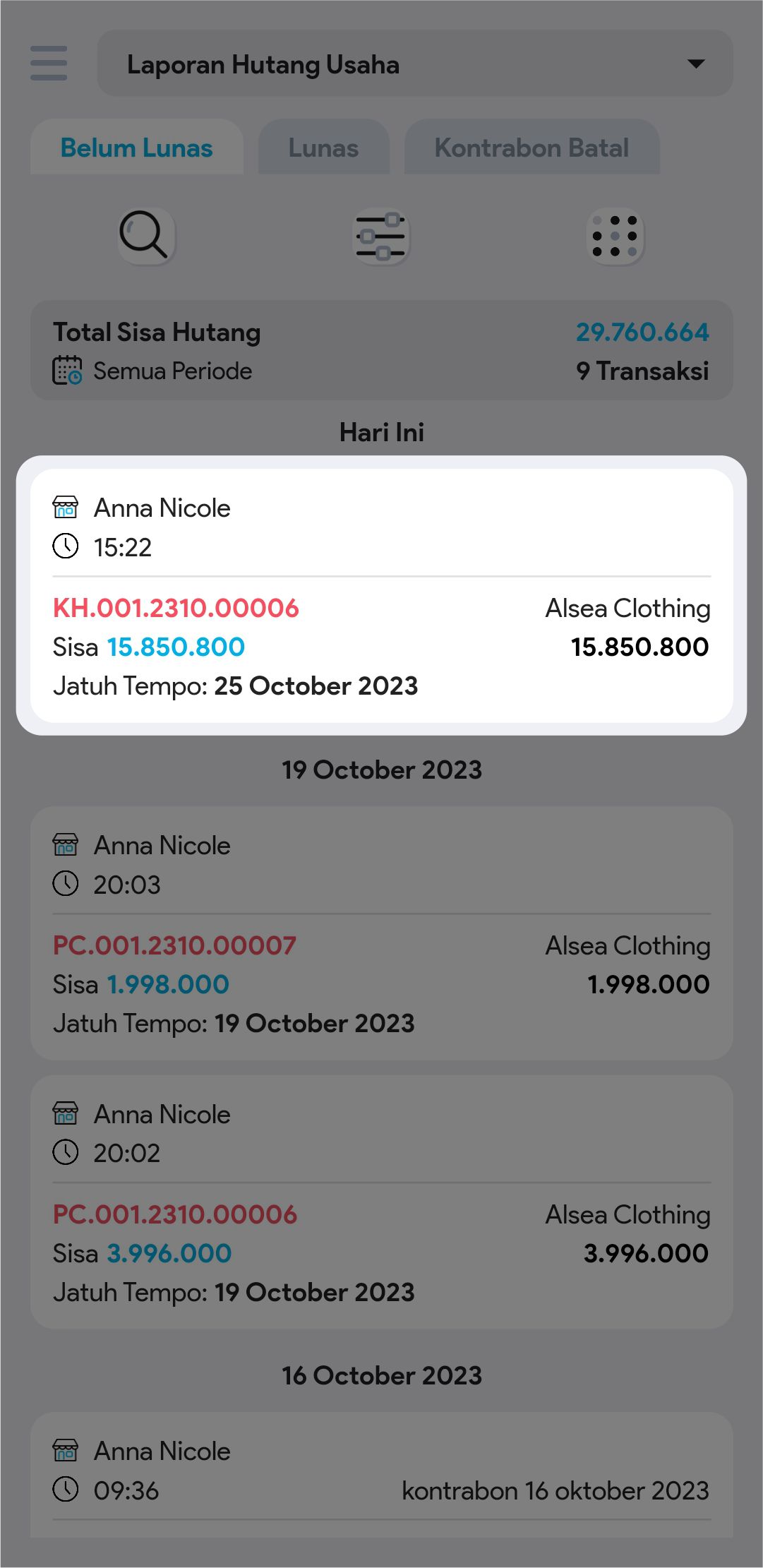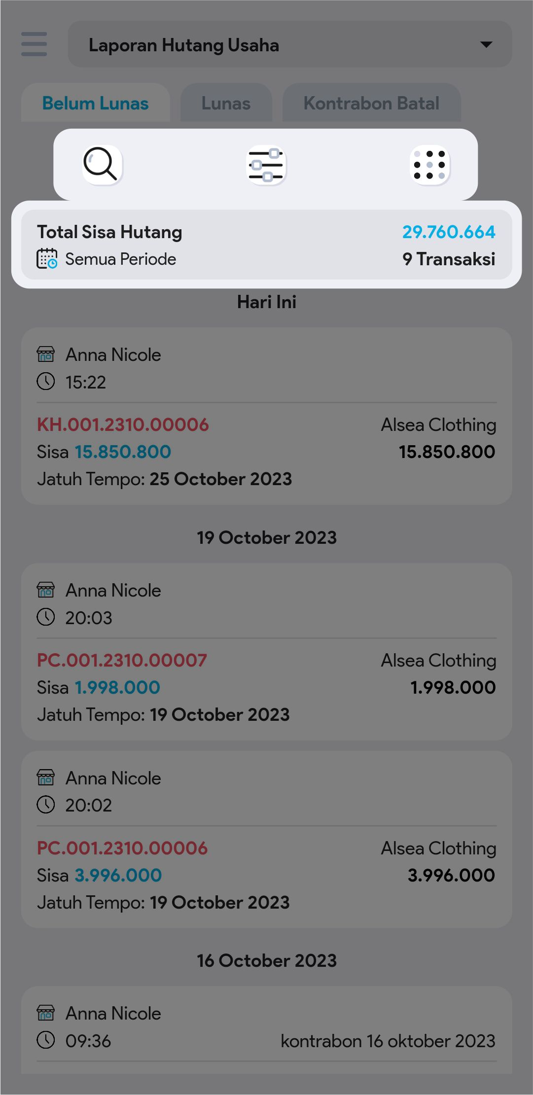 2.   Cari transaksi kontrabon yang diinginkan. Gunakan pembatasan filter jika diperlukan (tanggal, pemasok, jatuh tempo, outlet, nomor penerimaan / kontrabon)