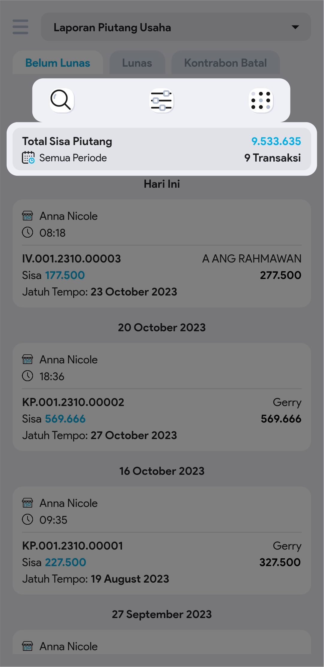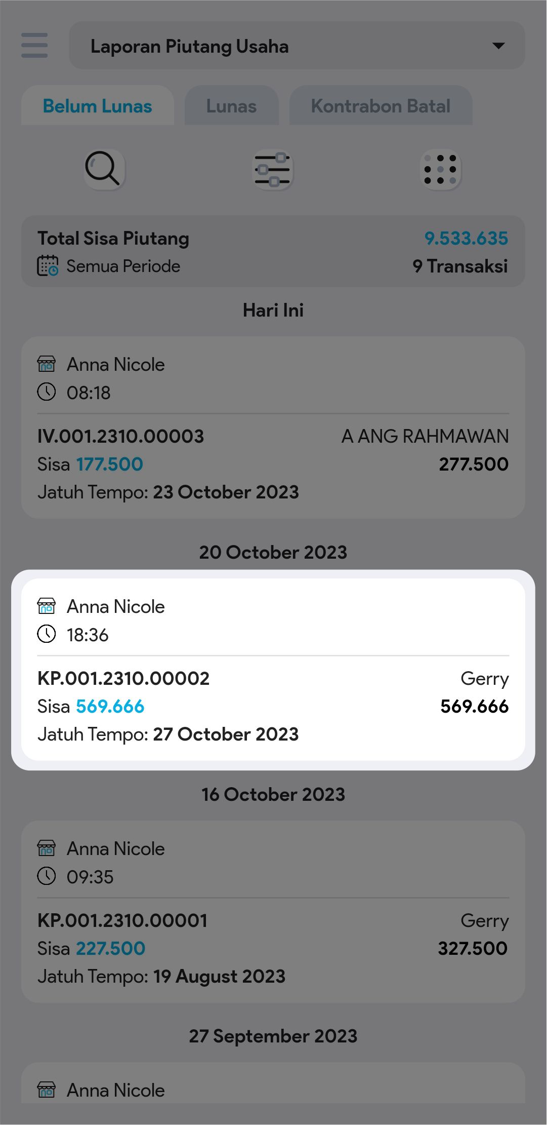 2. Cari transaksi kontrabon yang diinginkan. Gunakan pembatasan filter jika diperlukan (tanggal, pelanggan, jatuh tempo, outlet, nomor invoice/ kontrabon)