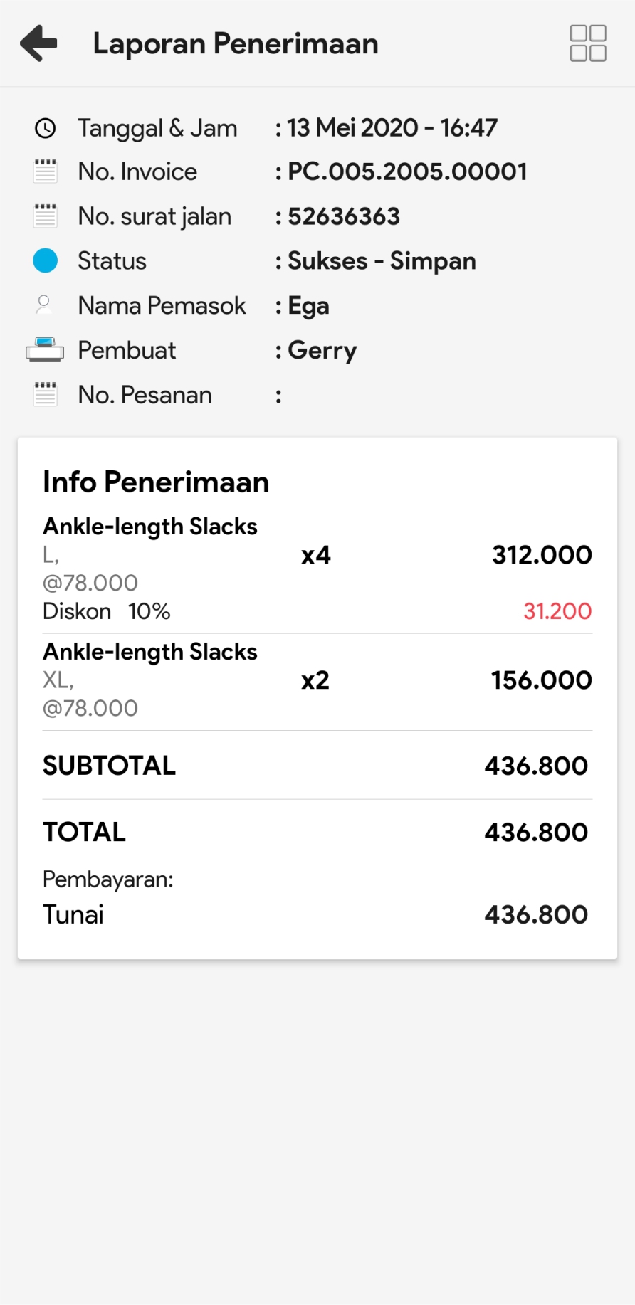 6. Detail informasi tentang transaksi penerimaan tersaji dengan lengkap