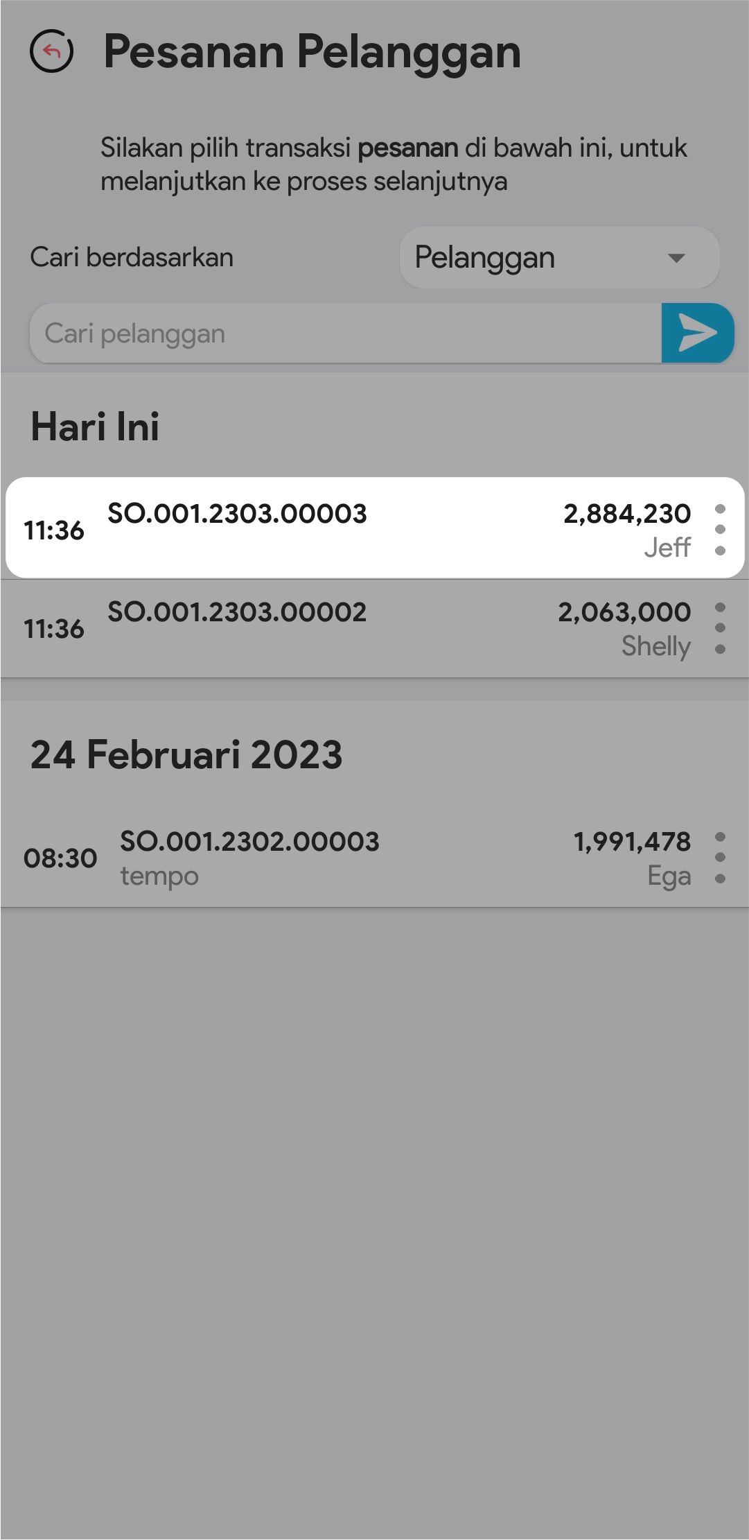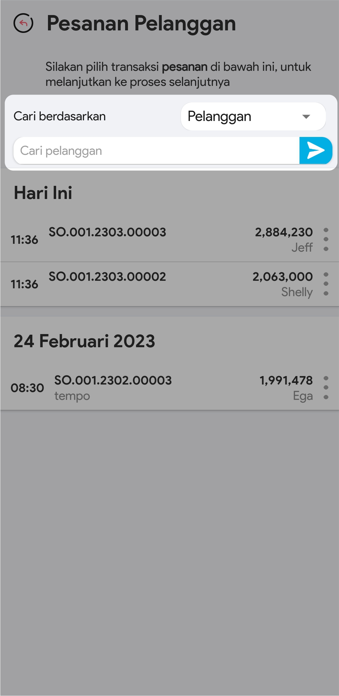 4.  Lakukan pencarian transaksi yang akan ditambahkan DP-nya di kolom pencarian. Anda bisa melakukan pencarian berdasarkan Nama Pelanggan/Nama Pesanan/No Pesanan