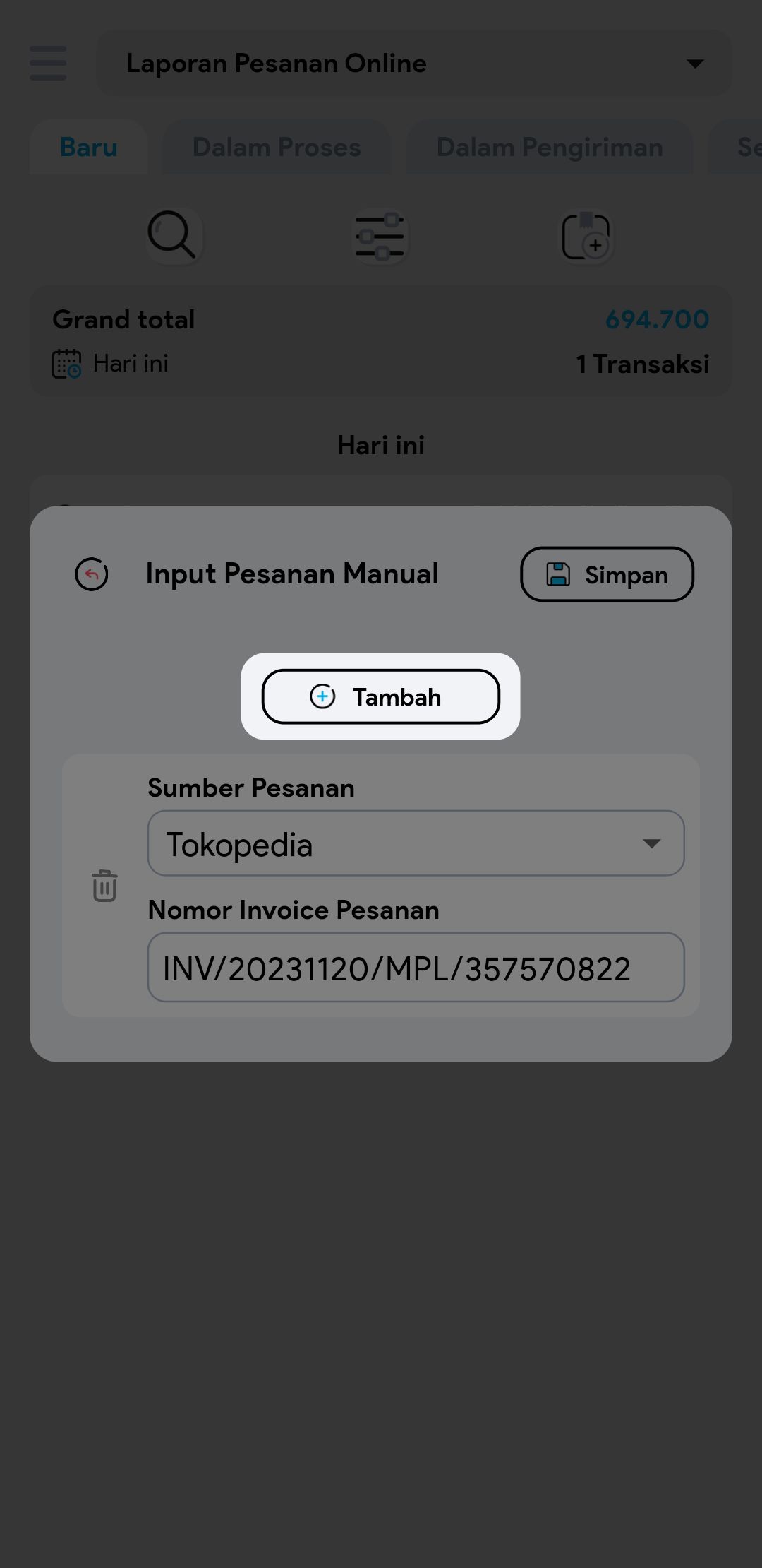 4.  Klik Tambah, jika ingin menambah pesanan lain.