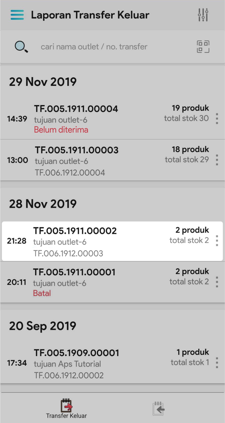 Data Pengirim : tanggal kirim, outlet pengirim, no transfer keluar, status dan pembuat transfer keluar
