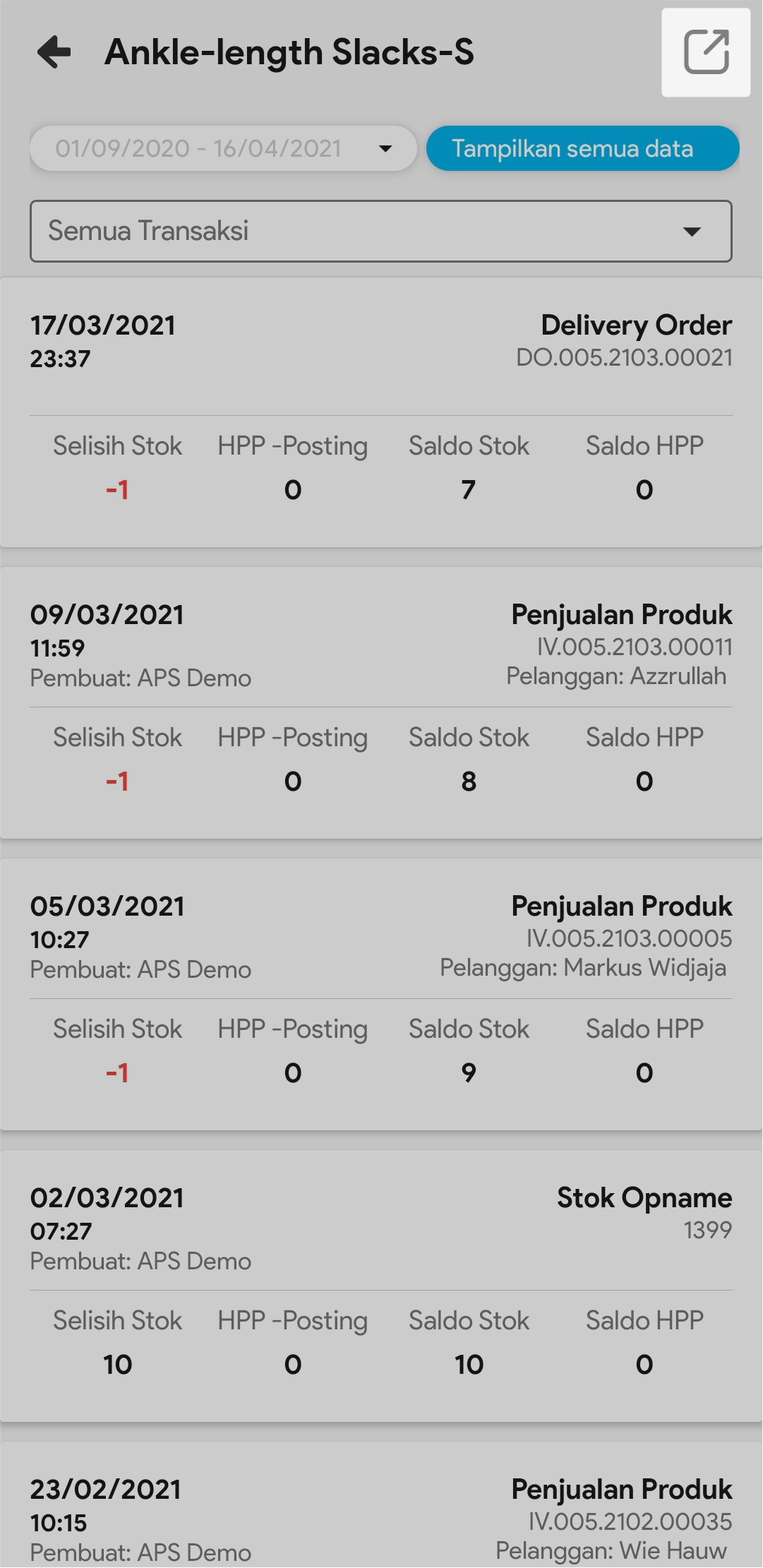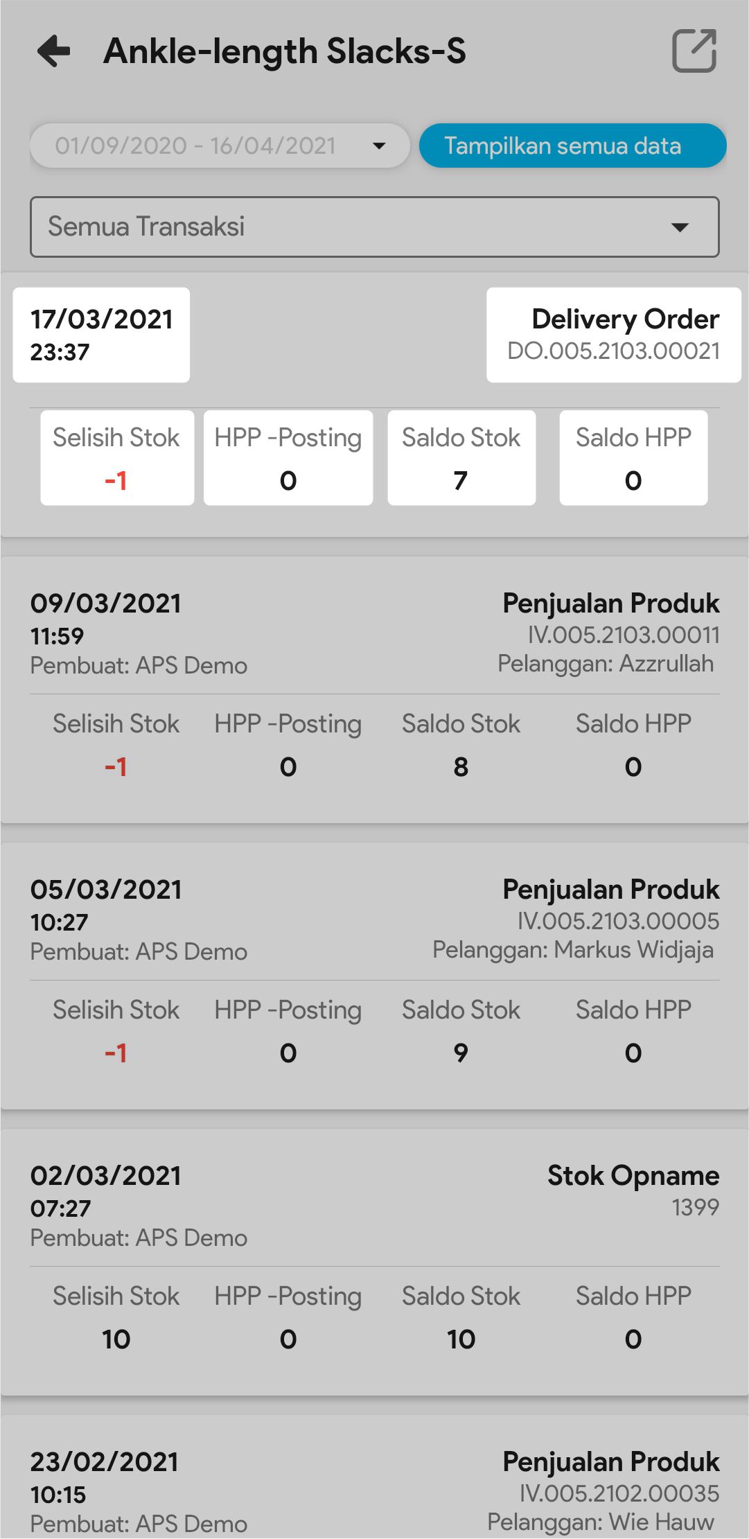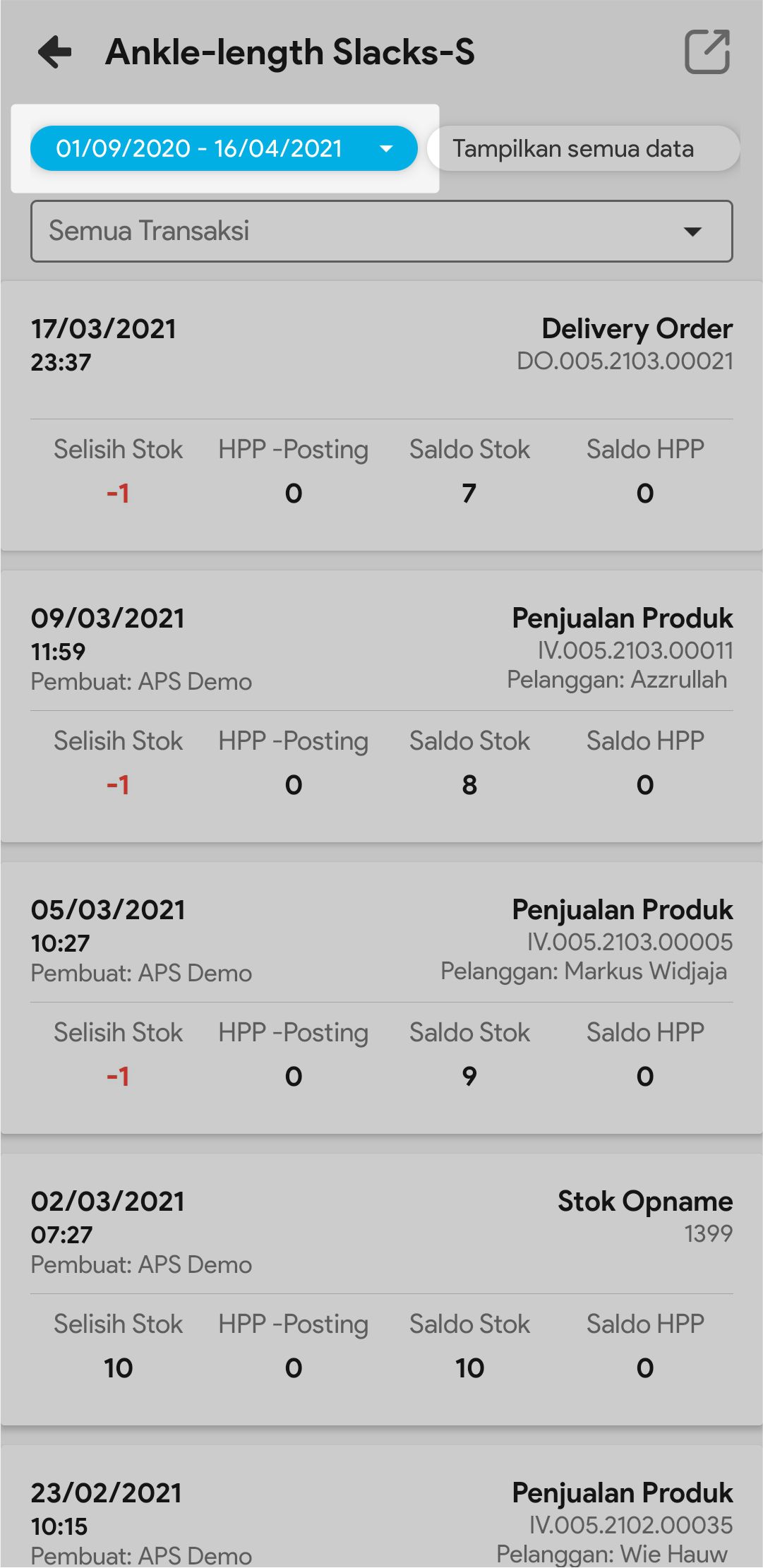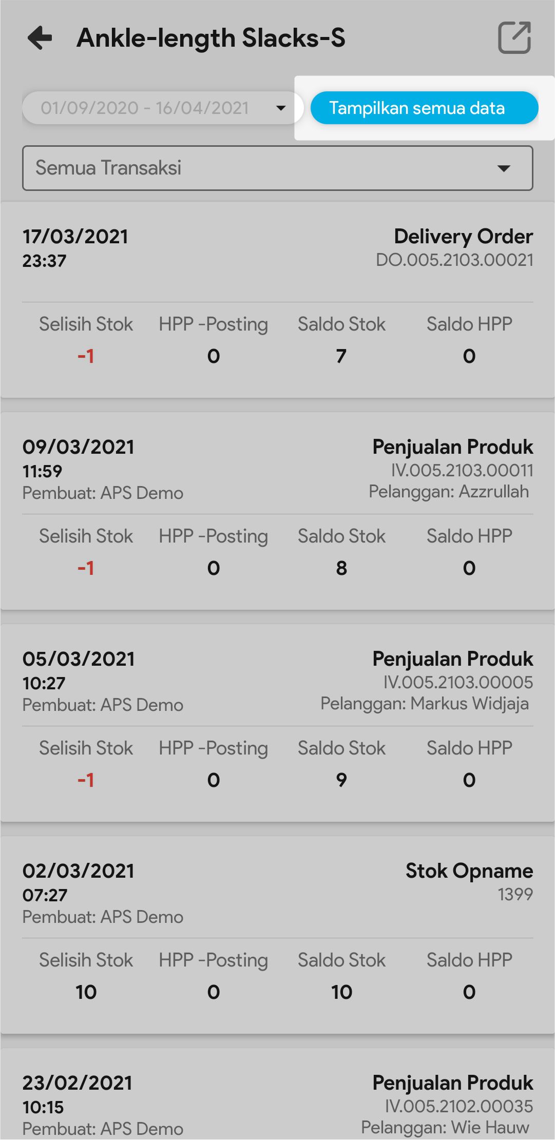 8. Pilih Tampilkan Semua Data bila ingin melihat semua pergerakan produk tersebut, dari sejak tanggal awal produk ada sampai tanggal sekarang