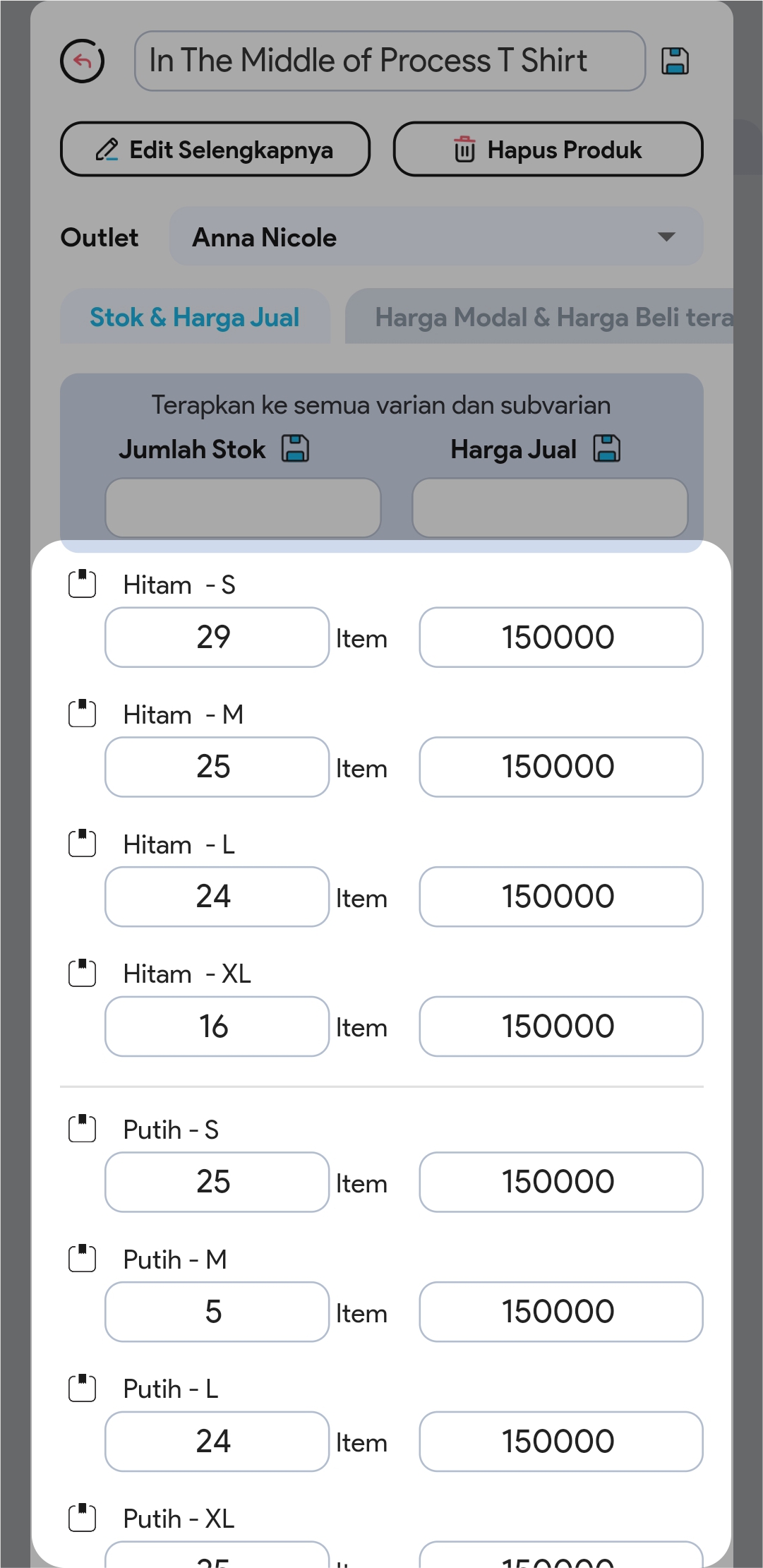 4. Edit Nama Produk / Jumlah Stok / Harga Jual dengan meng-klik Icon Edit pada bagian yang ingin Anda ubah