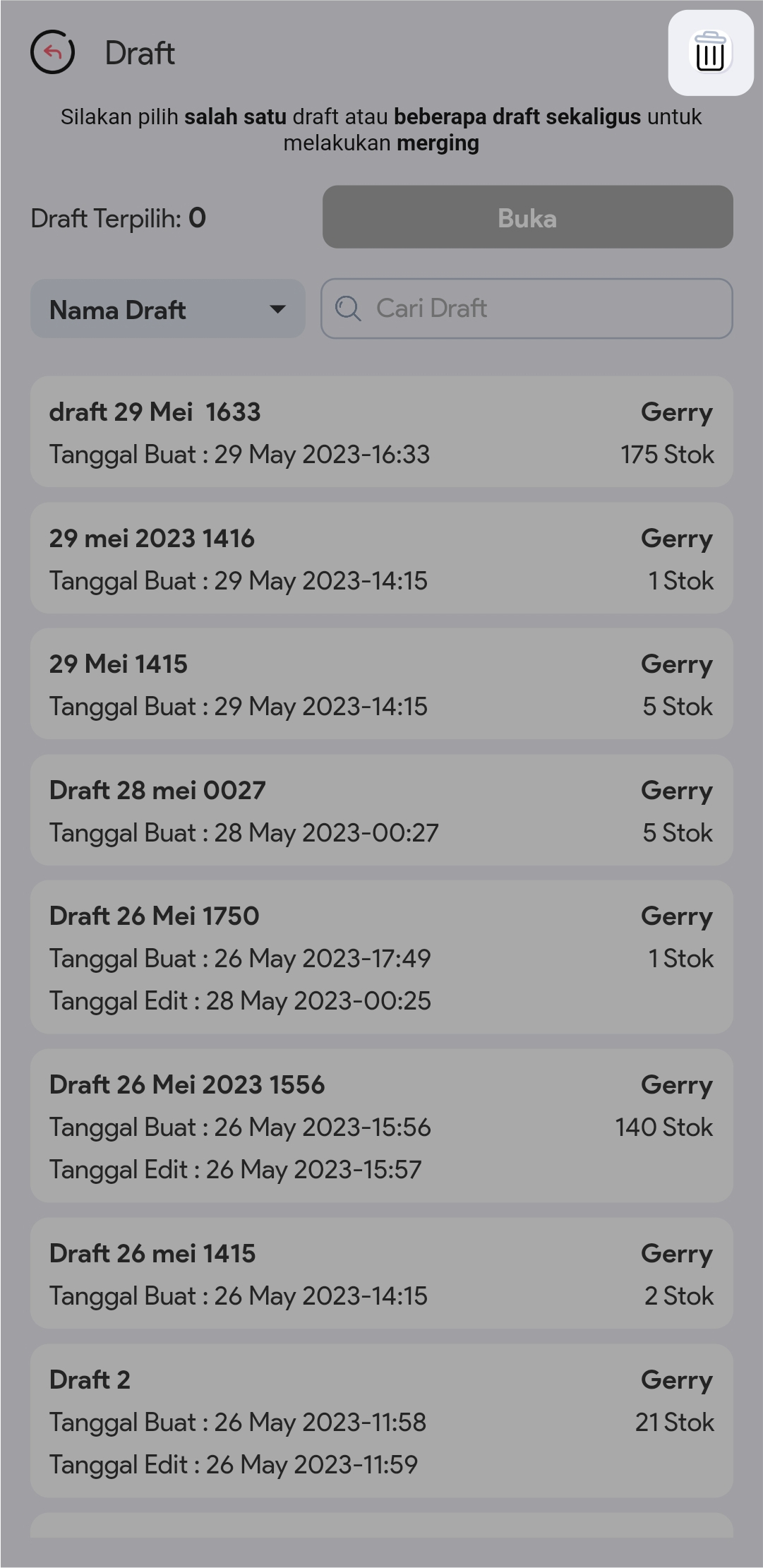 5. Pilih draft yang dingin dihapus dengan mengklik icon tempat sampah. Anda bisa menggunakan pencarian draft / nama pembuat draft, untuk memudahkan pencarian