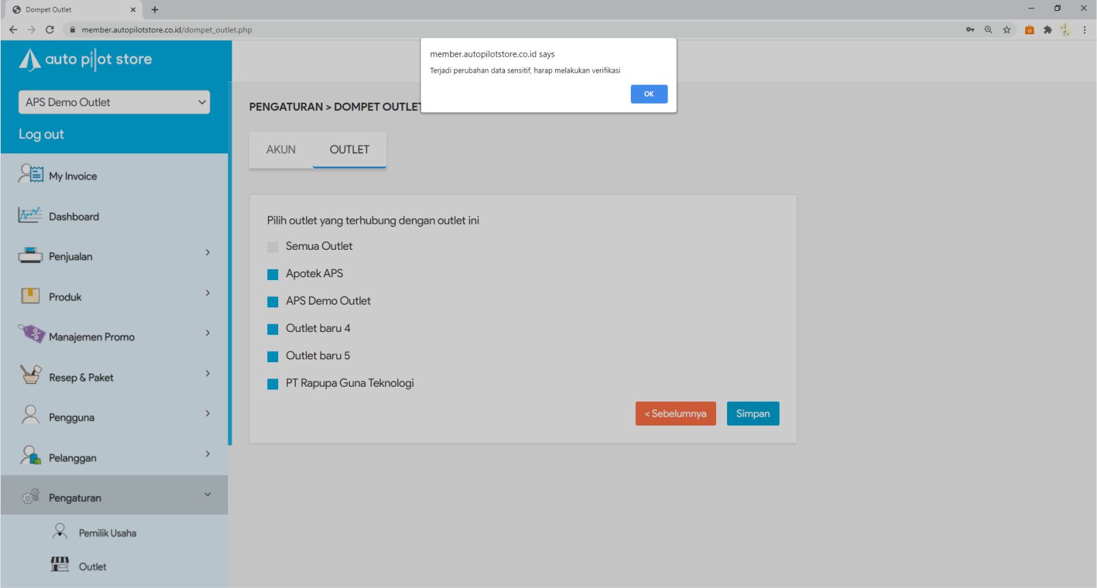 7. Pada Tabulasi Outlet, beri tanda di depan outlet yang terhubung dengan Dompet Outlet atau pilih semua outlet