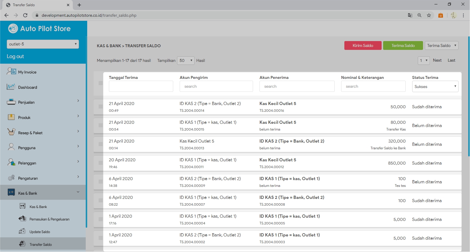 4. Secara otomatis sistem APS akan menampilkan transaksi terakhir yang terjadi. Silahkan mengatur jumlah tampilan per halaman (50,75,100,250)