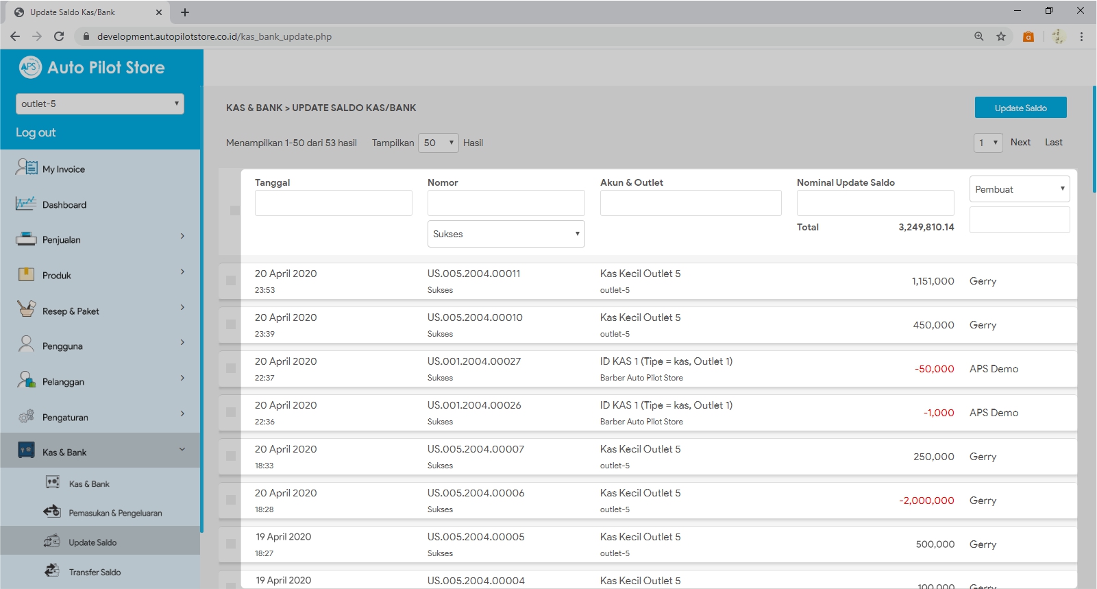 6. Pilih transaksi update saldo yang diinginkan untuk melihat informasi yang lebih detail dari update saldo tersebut.