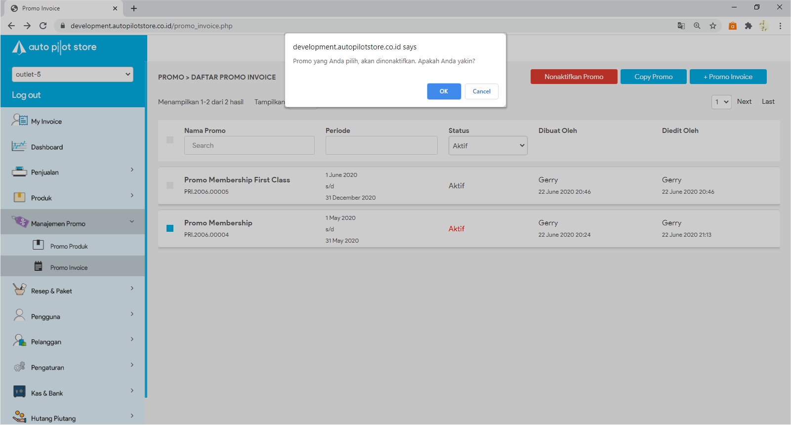 Catatan: Promo yang sudah habis masa berlaku nya, status keaktifan nya akan berwarna merah. Anda dapat menonaktifkan promo tersebut dengan cara: