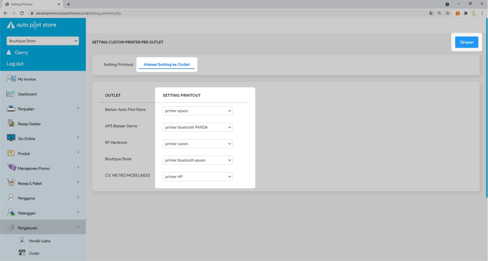 5. Di tabulasi Alokasi Setting ke Outlet, silakan pilih template printout yang akan Anda gunakan di setiap outlet Anda