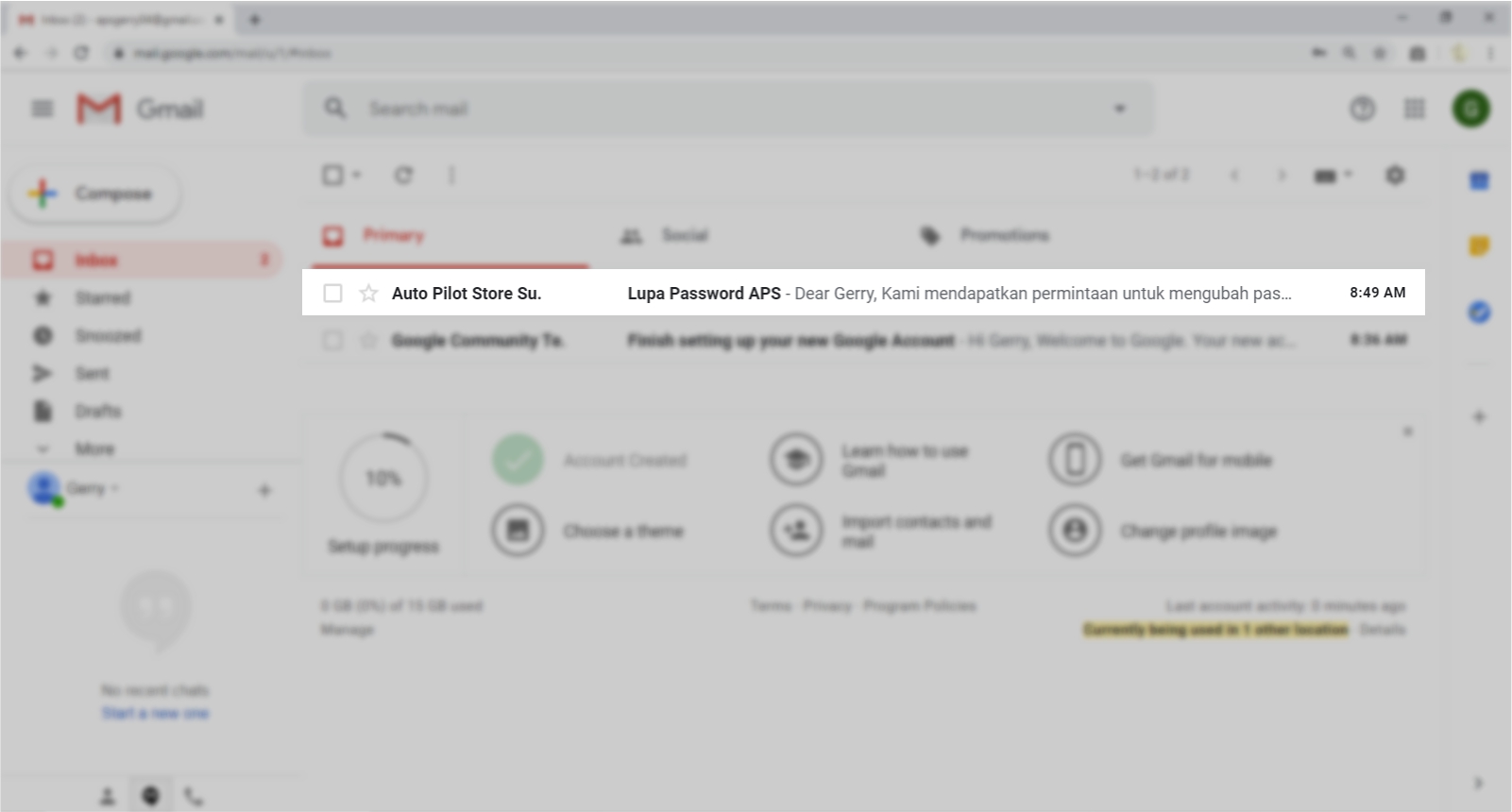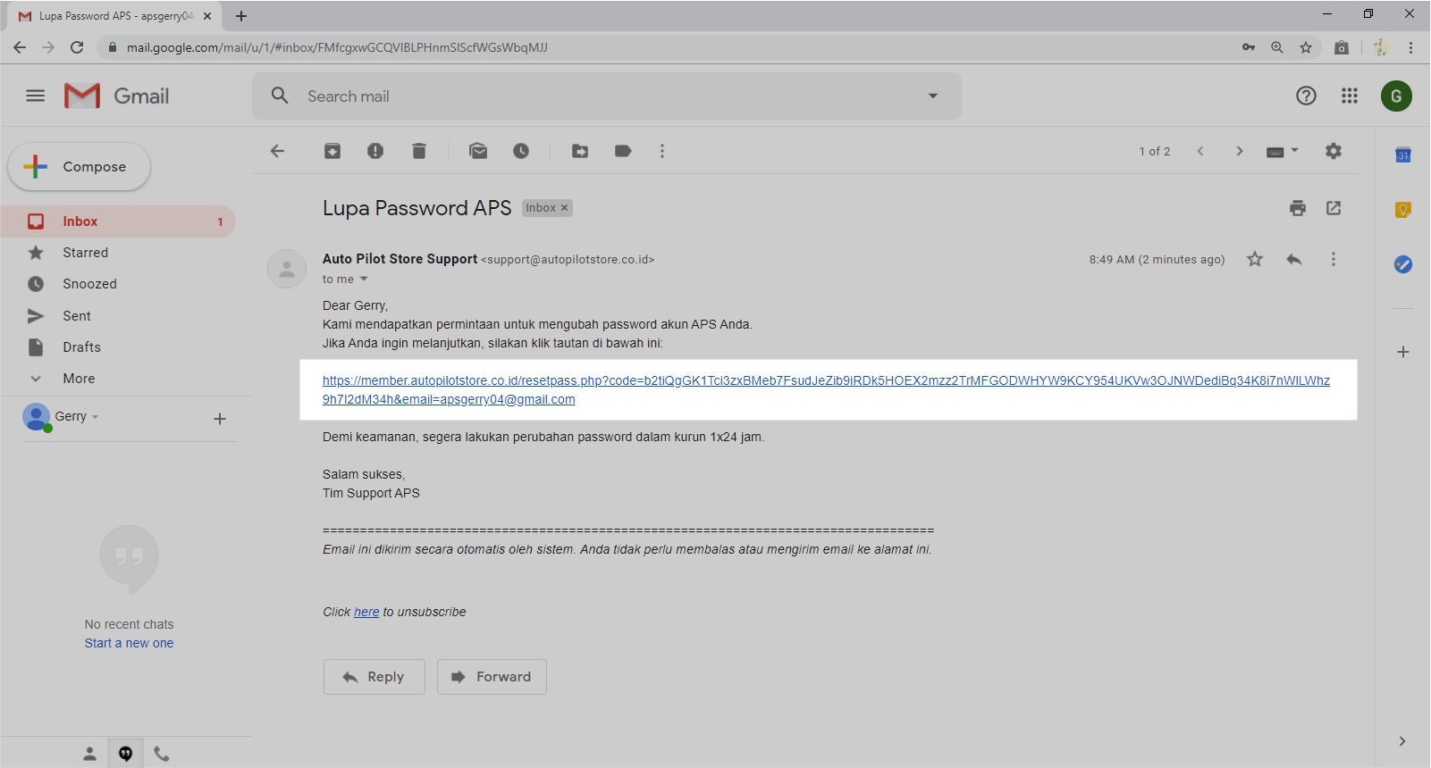 5. Pilih Email dengan subject Lupa Password APS (Pada Inbox atau Folder Spam)