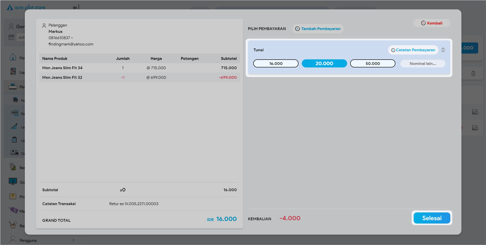 15. Selesaikan proses pembayaran (apabila nilai barang pengganti lebih besar). Pilih jenis pembayaran dan masukkan jumlah pembayaran