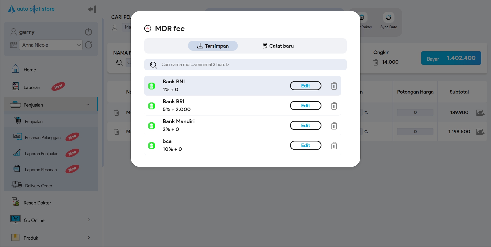 Penambahan Besaran MDR Fee dilakukan saat mencatatkan transaksi Penjualan pada fasilitas Penjualan. Besaran MDR Fee dapat dibuat berbeda-beda untuk setiap bank. Berikut caranya: