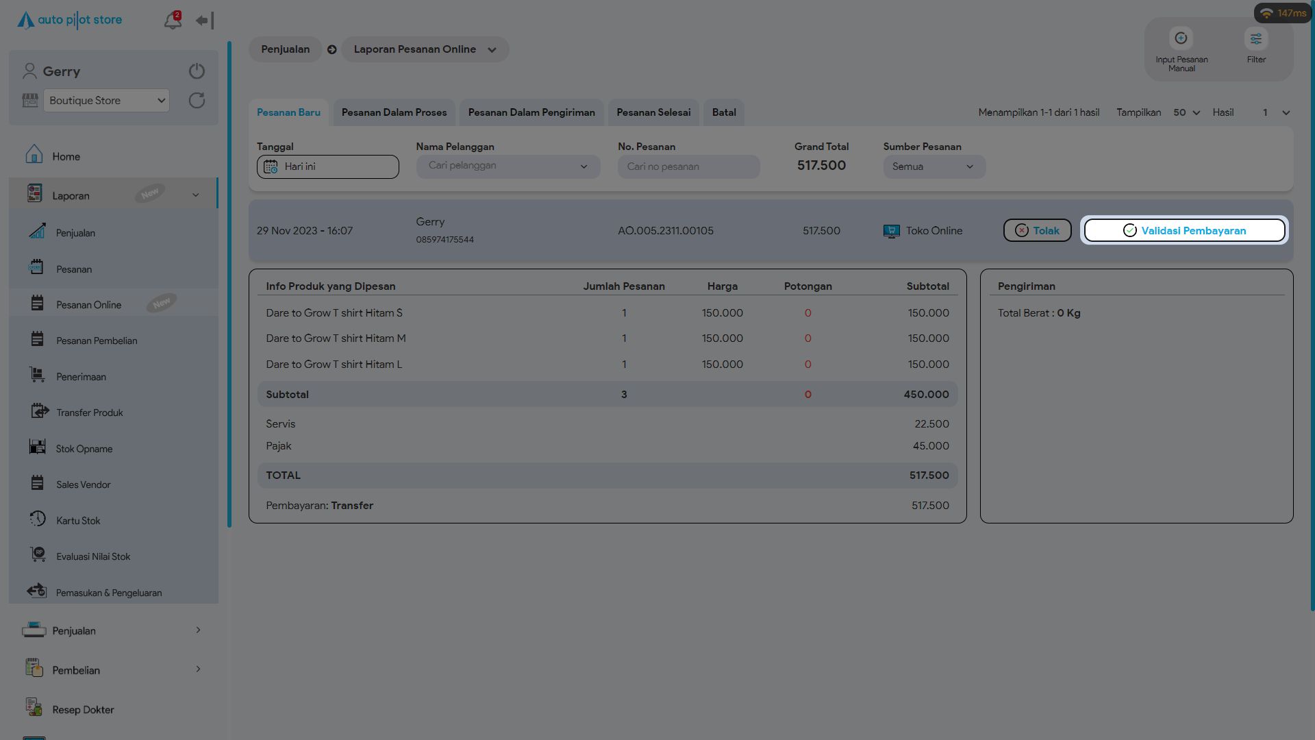 3. Klik Validasi Pembayaran pada pesanan yang bersumber pada Toko Online
