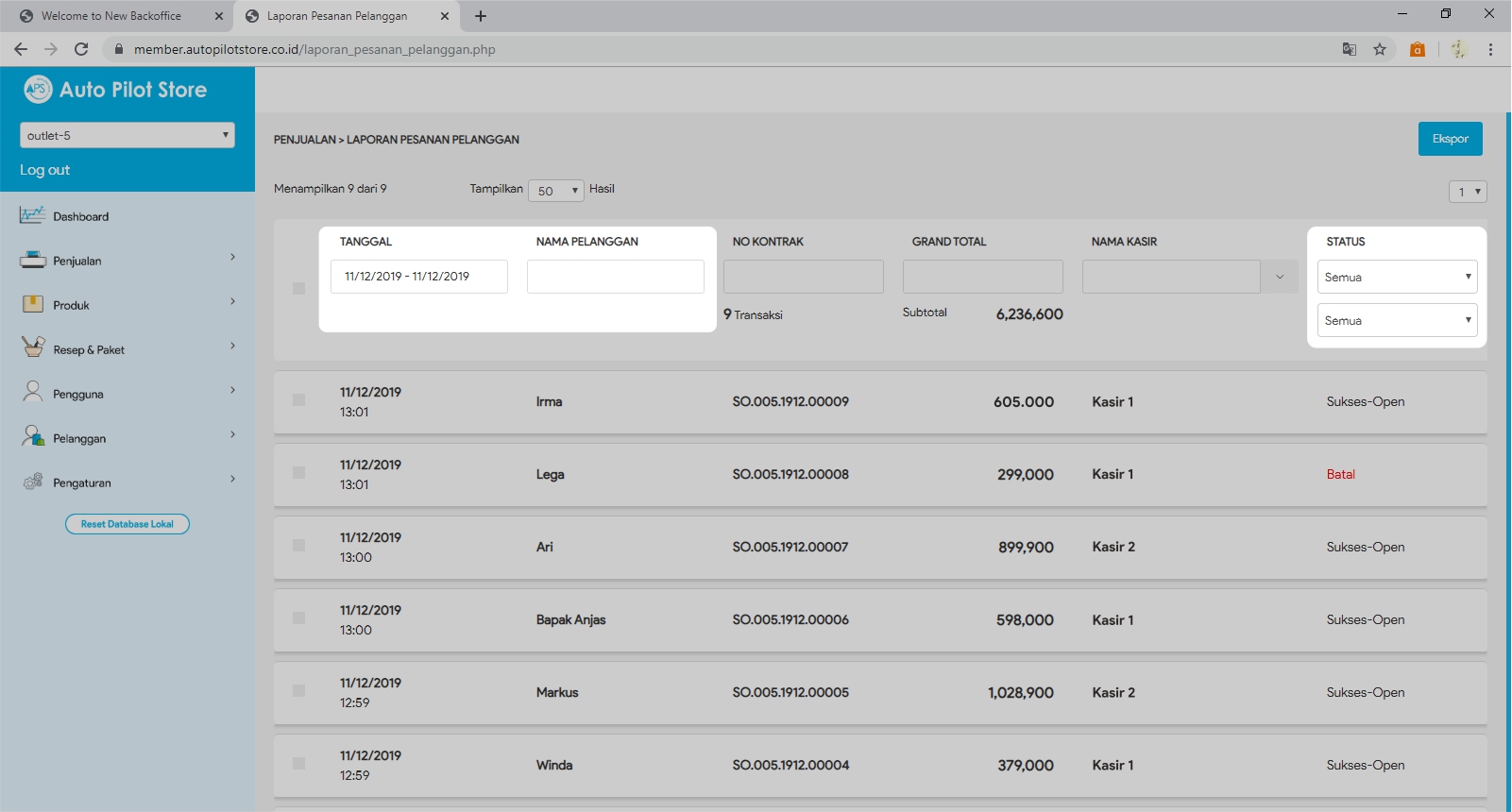 3. Pilih transaksi pesanan pelanggan mana yang akan diekspor. Lakukan pengaturan di kolom tanggal, nama pelanggan atau status transaksi (tergantung kebutuhan)