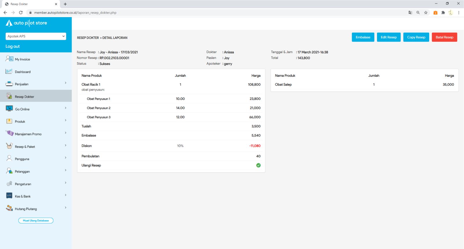 6. Untuk meng copy resep, mengedit resep ataupun membatalkan resep, klik tombol sesuai fungsi yang ingin Anda lakukan