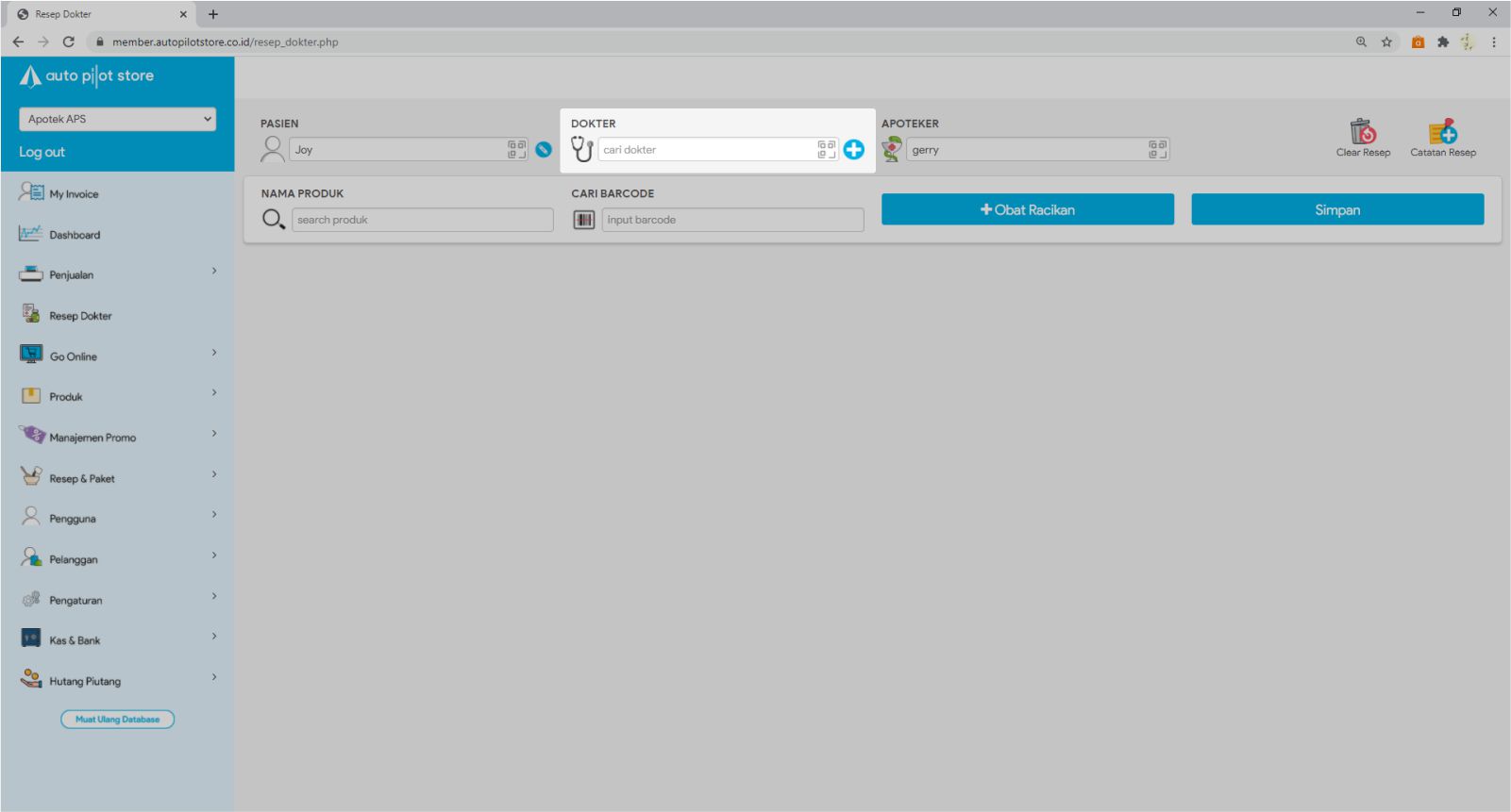 Fasilitas resep dokter digunakan oleh apoteker atau pengguna yang berwenang, untuk mengatur komposisi dari resep obat yang diberikan oleh dokter. Berikut tahapan membuat resep dokter: