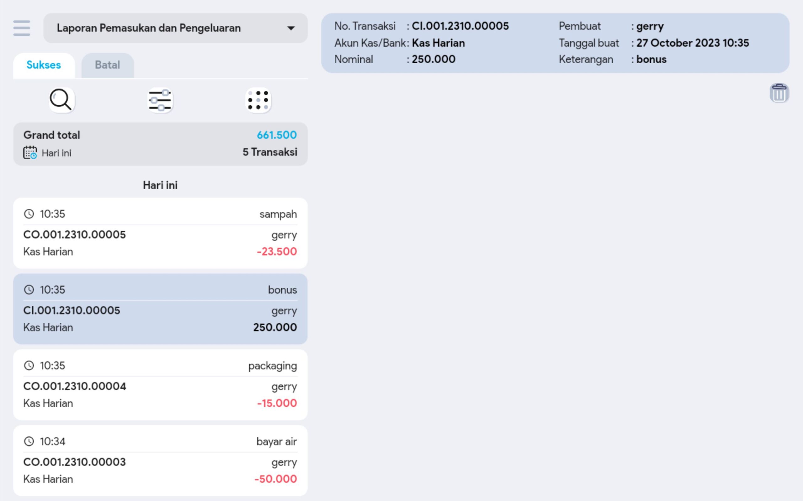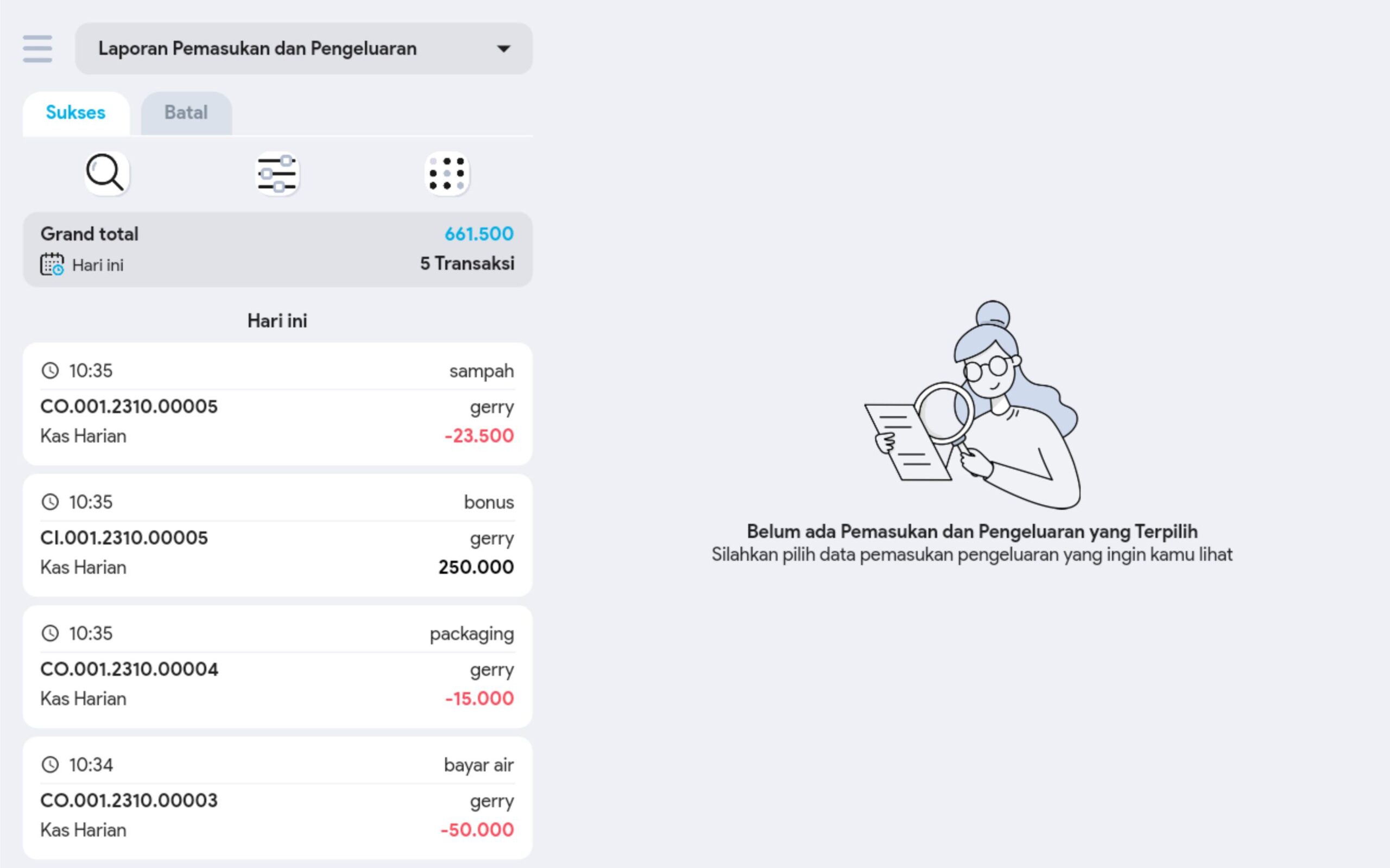 6. Cari dan pilih transaksi pemasukan pengeluaran yang diinginkan untuk melihat informasi lebih detail