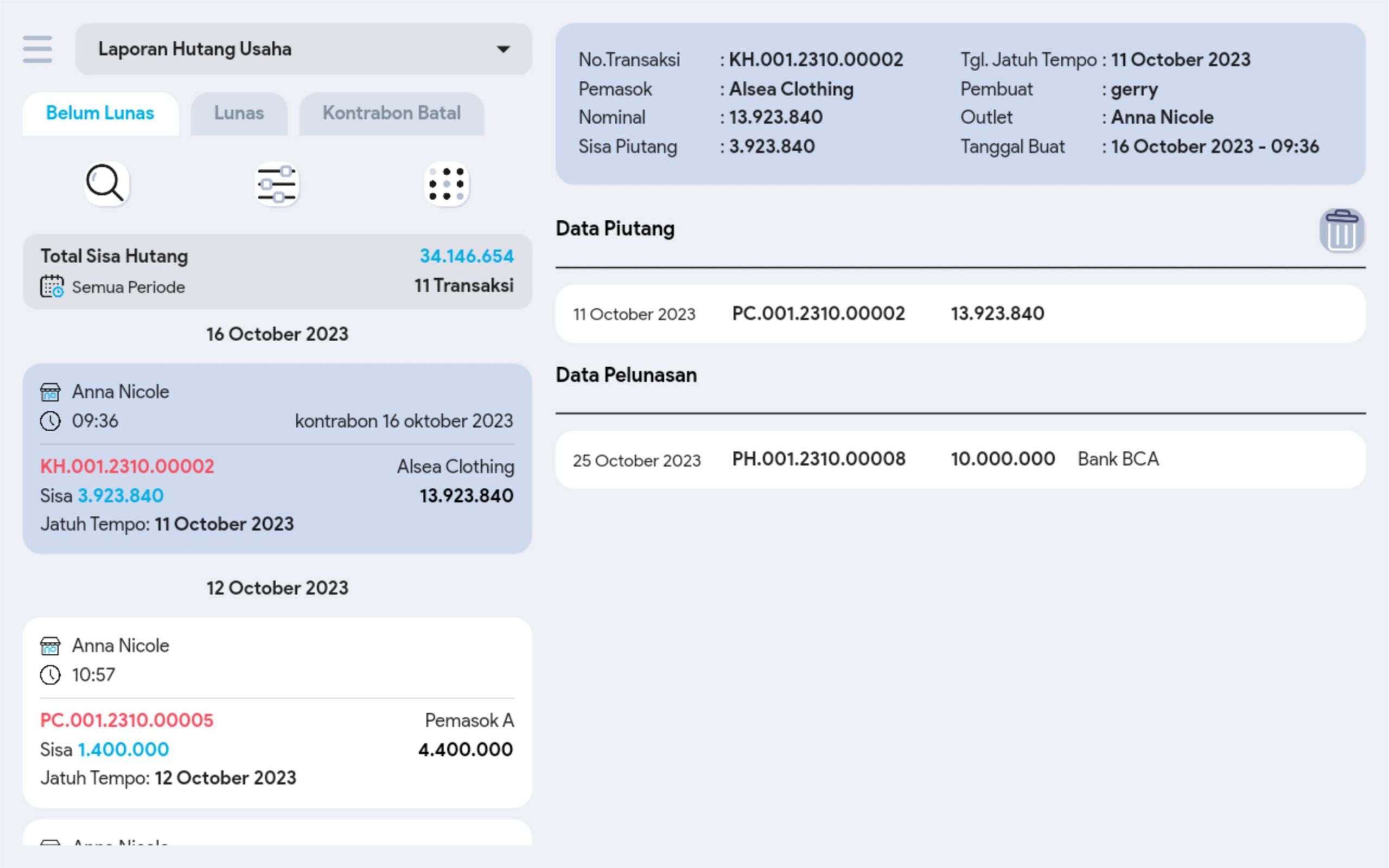 6. Cari dan pilih transaksi hutang yang diinginkan untuk melihat informasi lebih detail