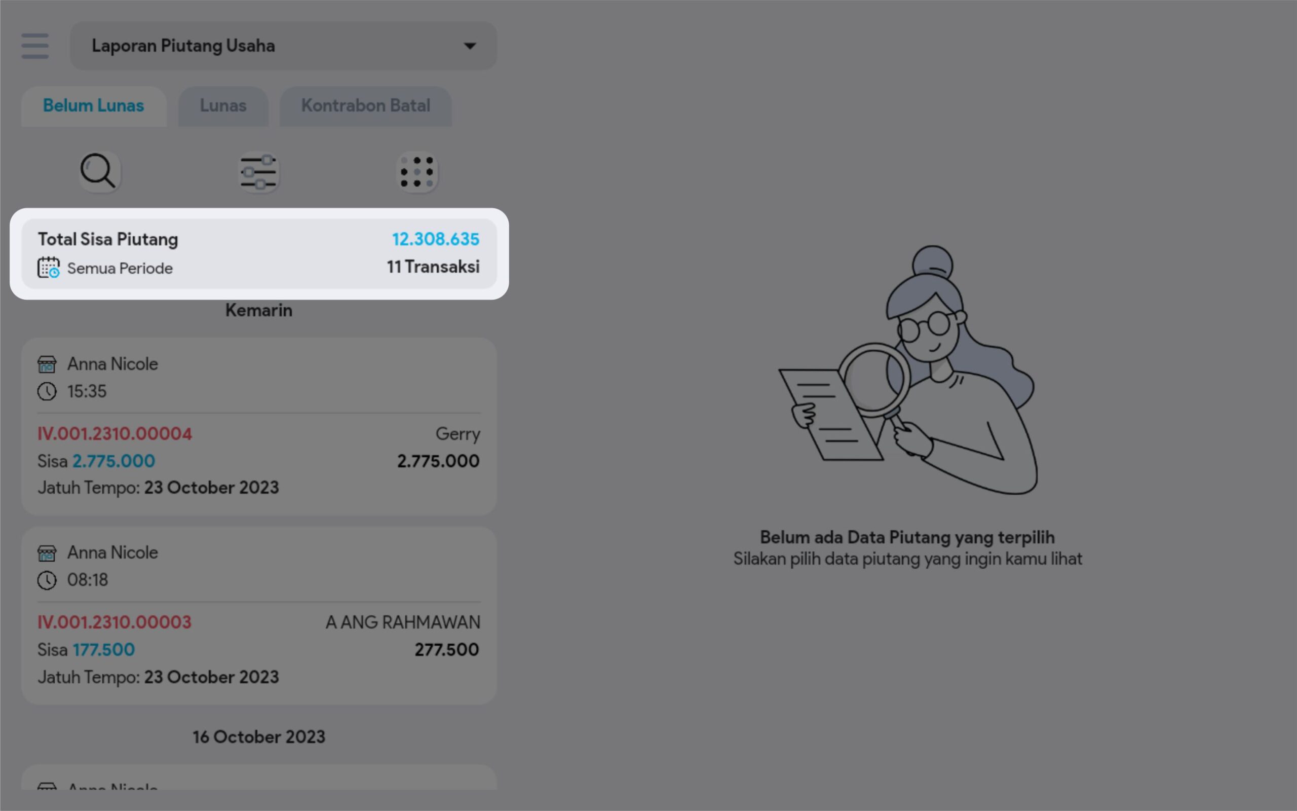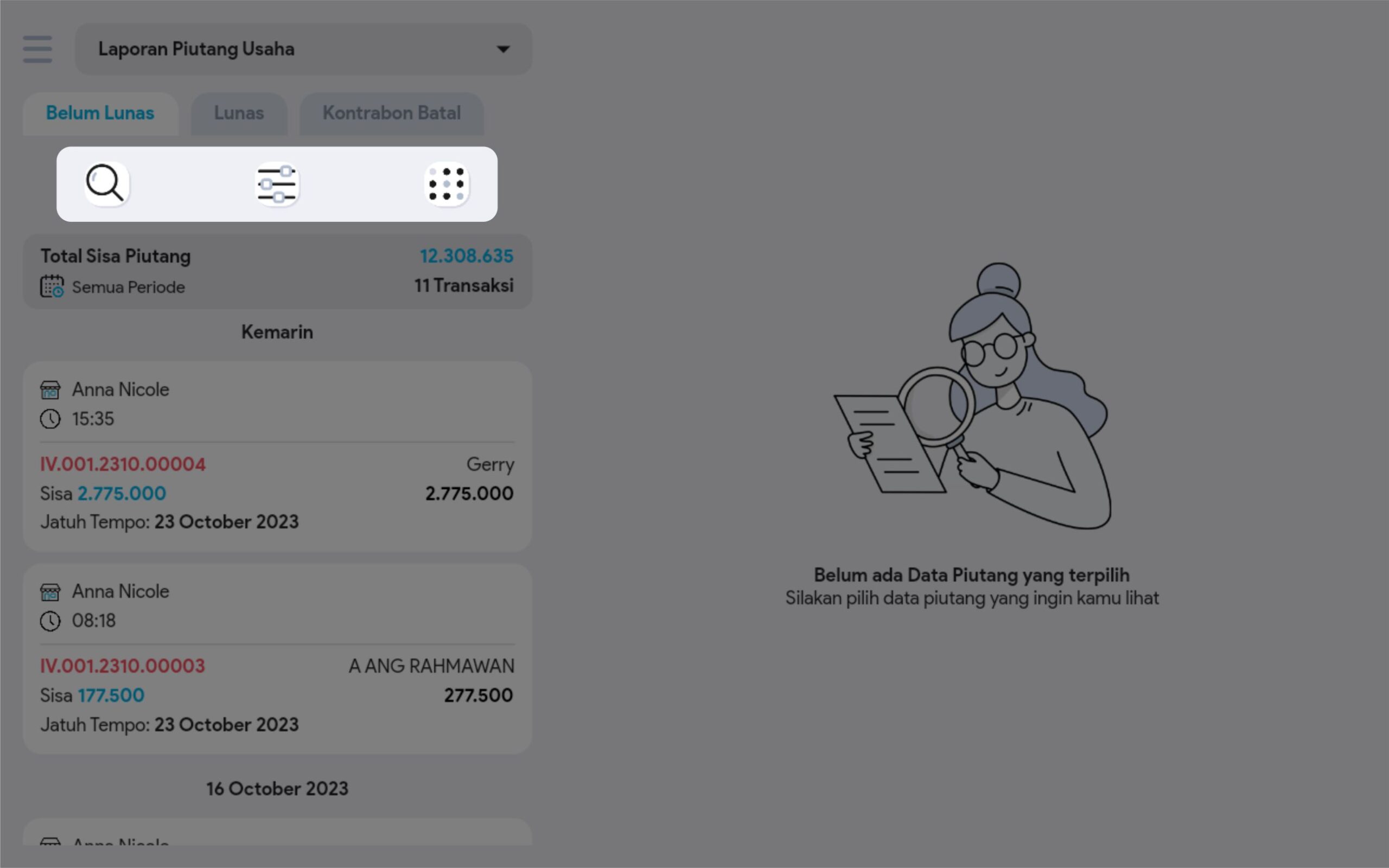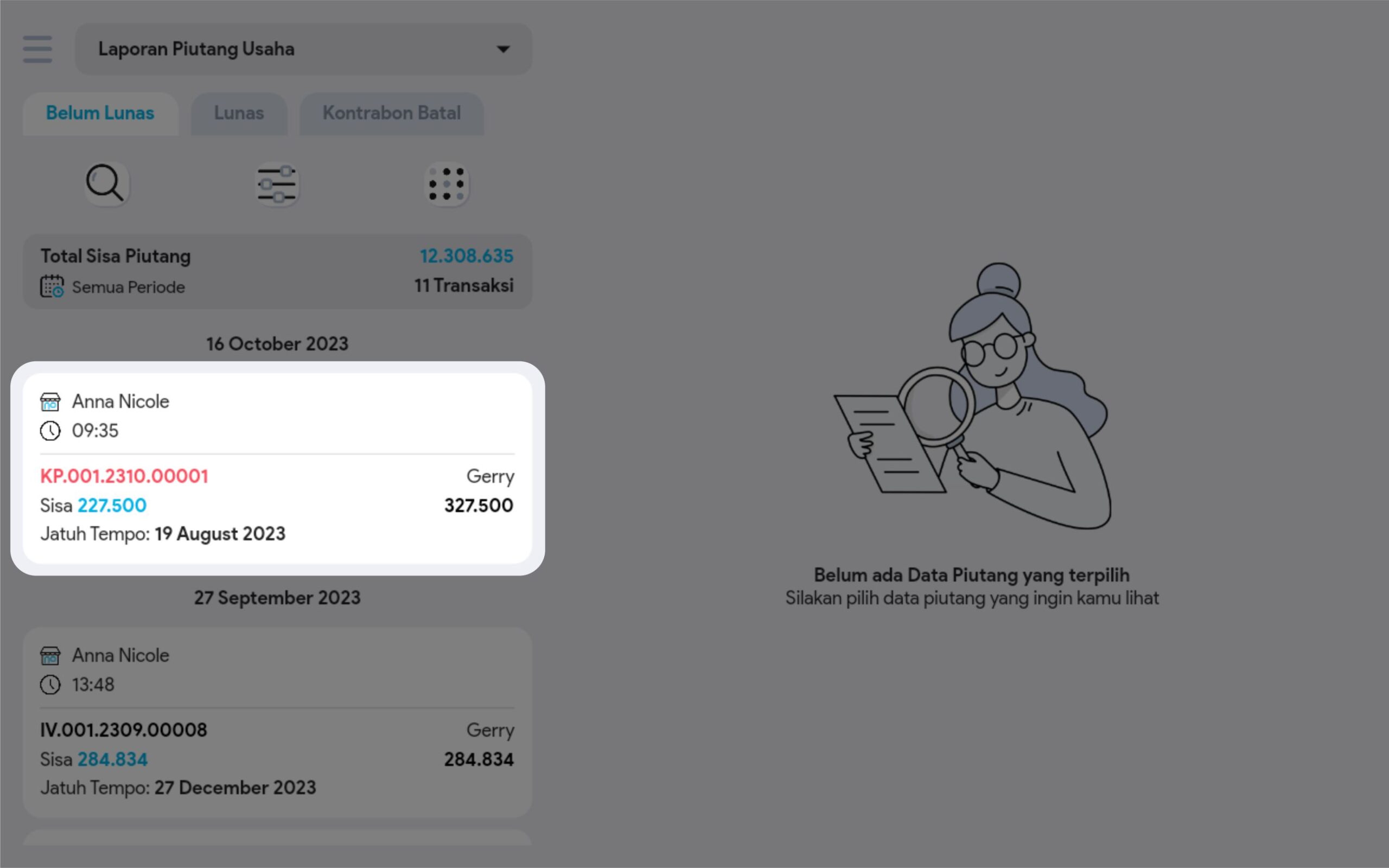 6. Cari dan pilih transaksi piutang yang diinginkan untuk melihat informasi lebih detail