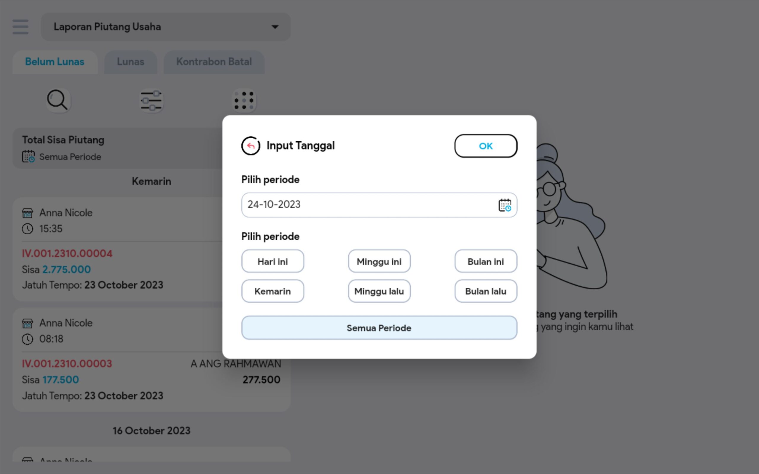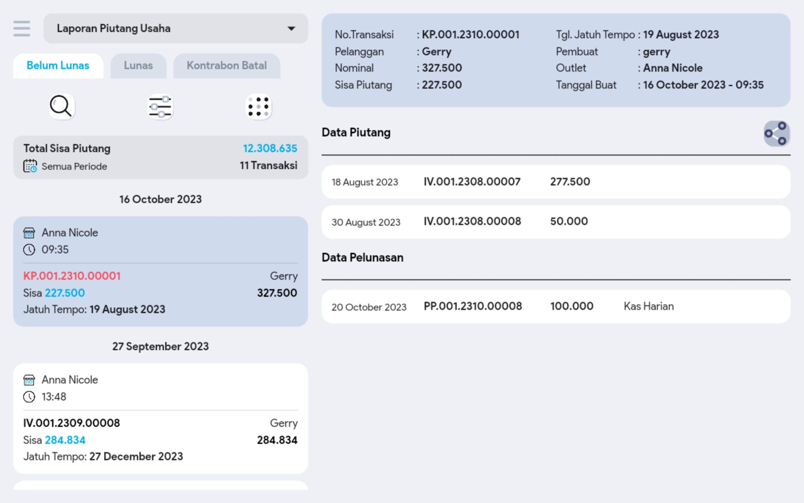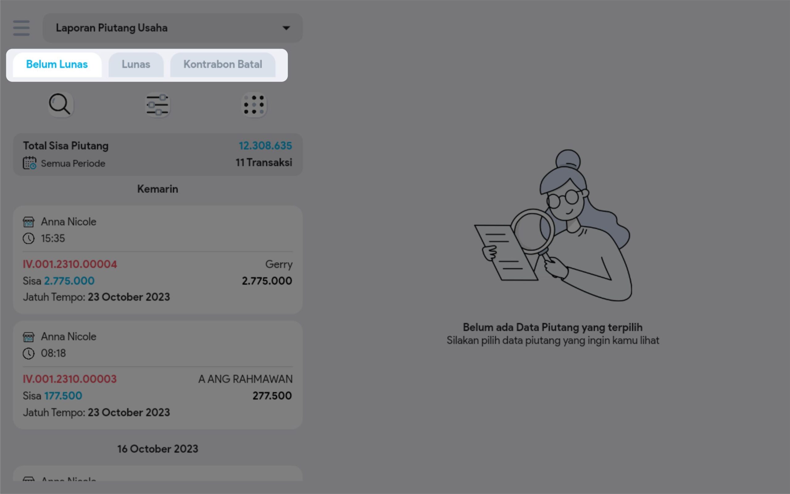 6. Cari dan pilih transaksi piutang yang diinginkan untuk melihat informasi lebih detail