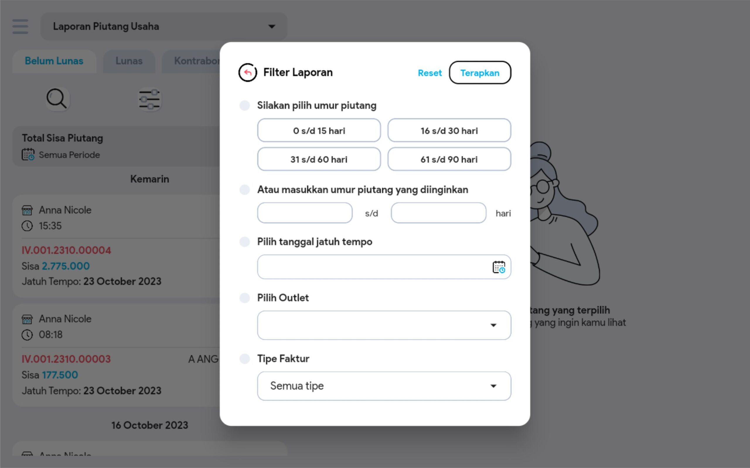 4. Untuk mencari transaksi tertentu, gunakan pembatasan filter jika diperlukan (tanggal jatuh tempo, umur piutang, pelanggan, outlet, no invoice / kontrabon)