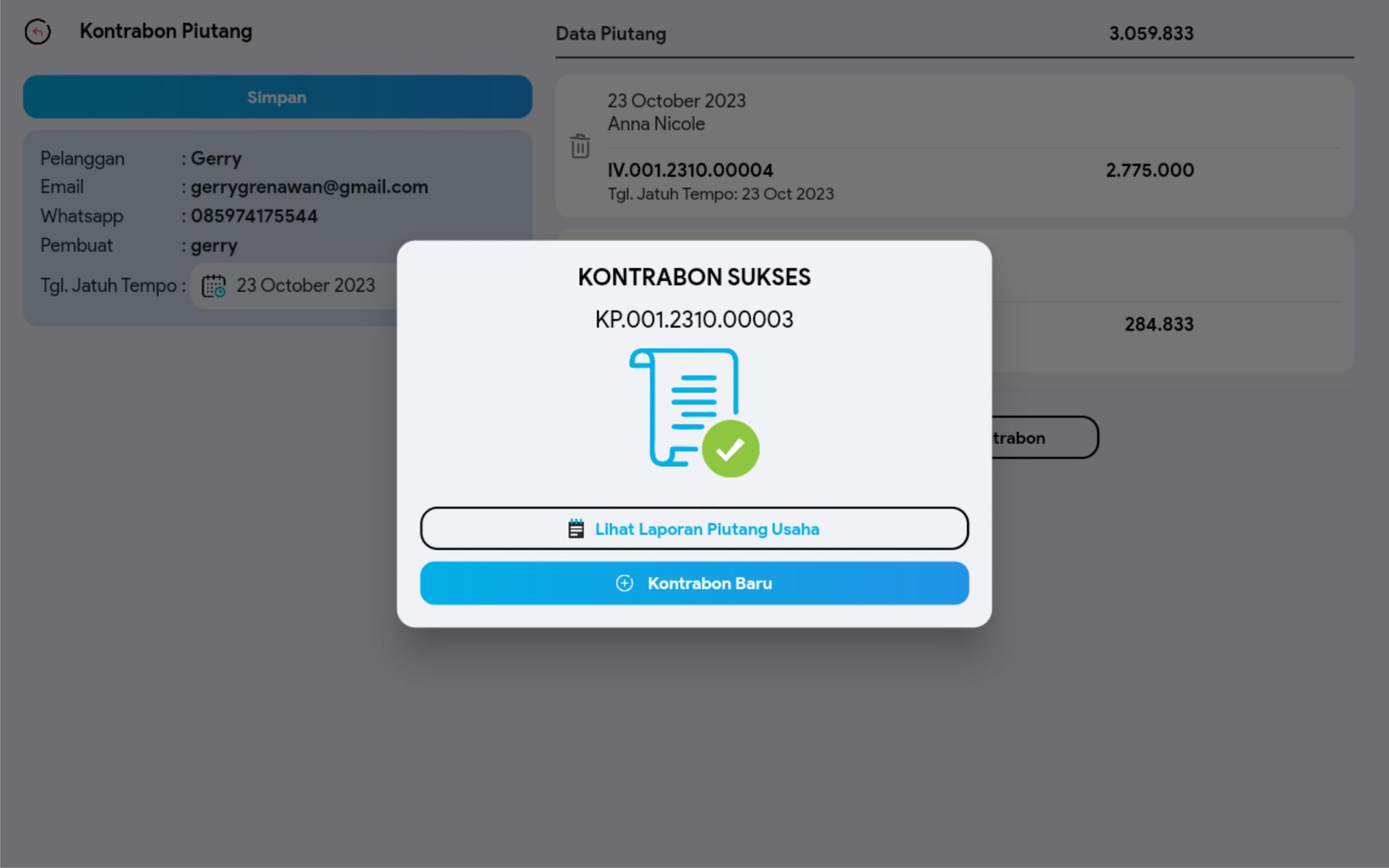 Pilih Lihat Laporan Piutang Usaha untuk melihat laporan kontrabon atau pilih +Kontrabon baru untuk membuat kontrabon piutang lainnya