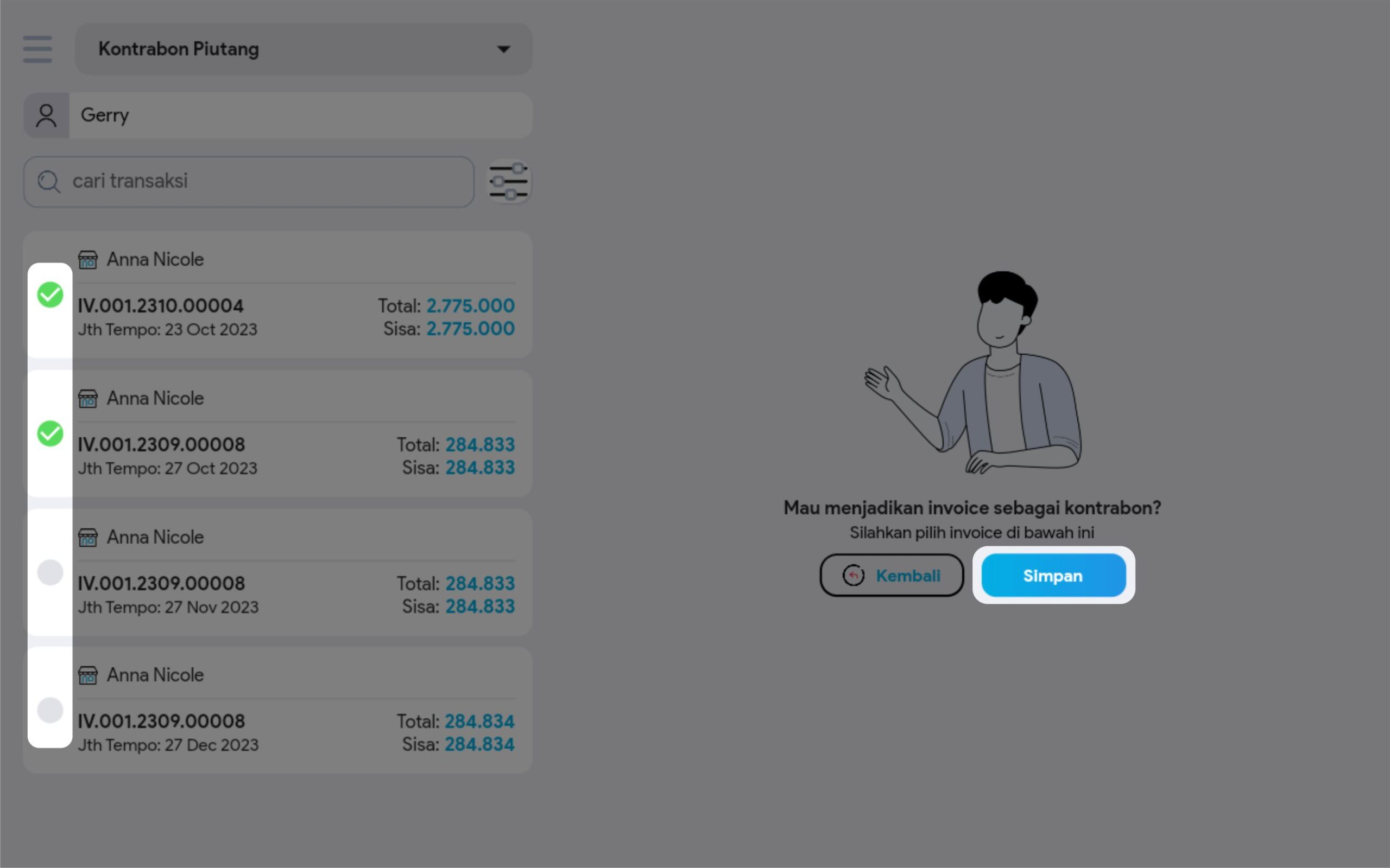 6. Pilih transaksi yang ingin dijadikan kontrabon, kemudian klik button Simpan
