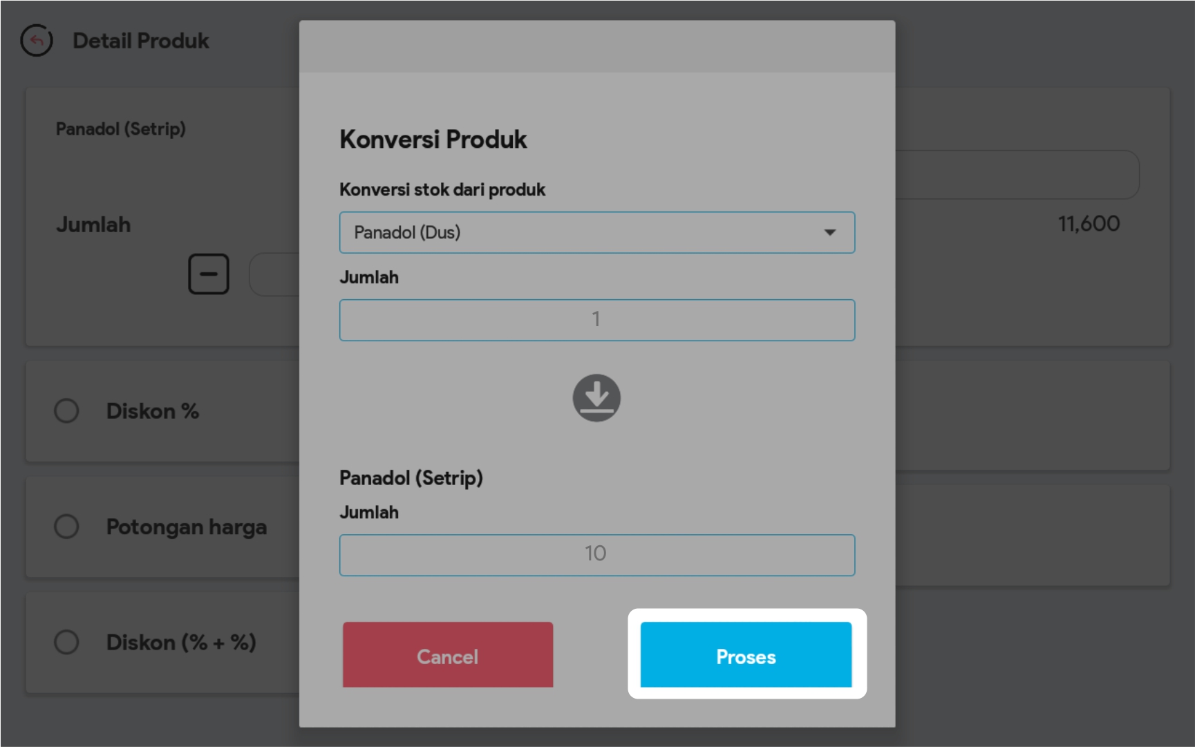 Contoh: Anda ingin menjual produk A secara satuan, sedangkan stok produk A yang satuan kurang, sehingga perlu dilakukan konversi dari stok Produk A yang dus an ke stok produk A yang satuan.