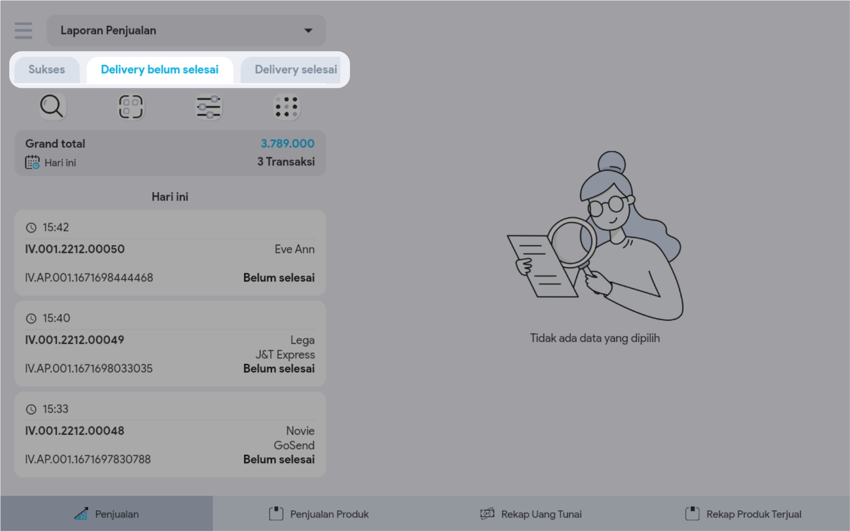 2. Pilih tabulasi Delivery Belum Selesai. Maka secara otomatis akan menampilkan transaksi yang belum selesai di terima pelanggan.