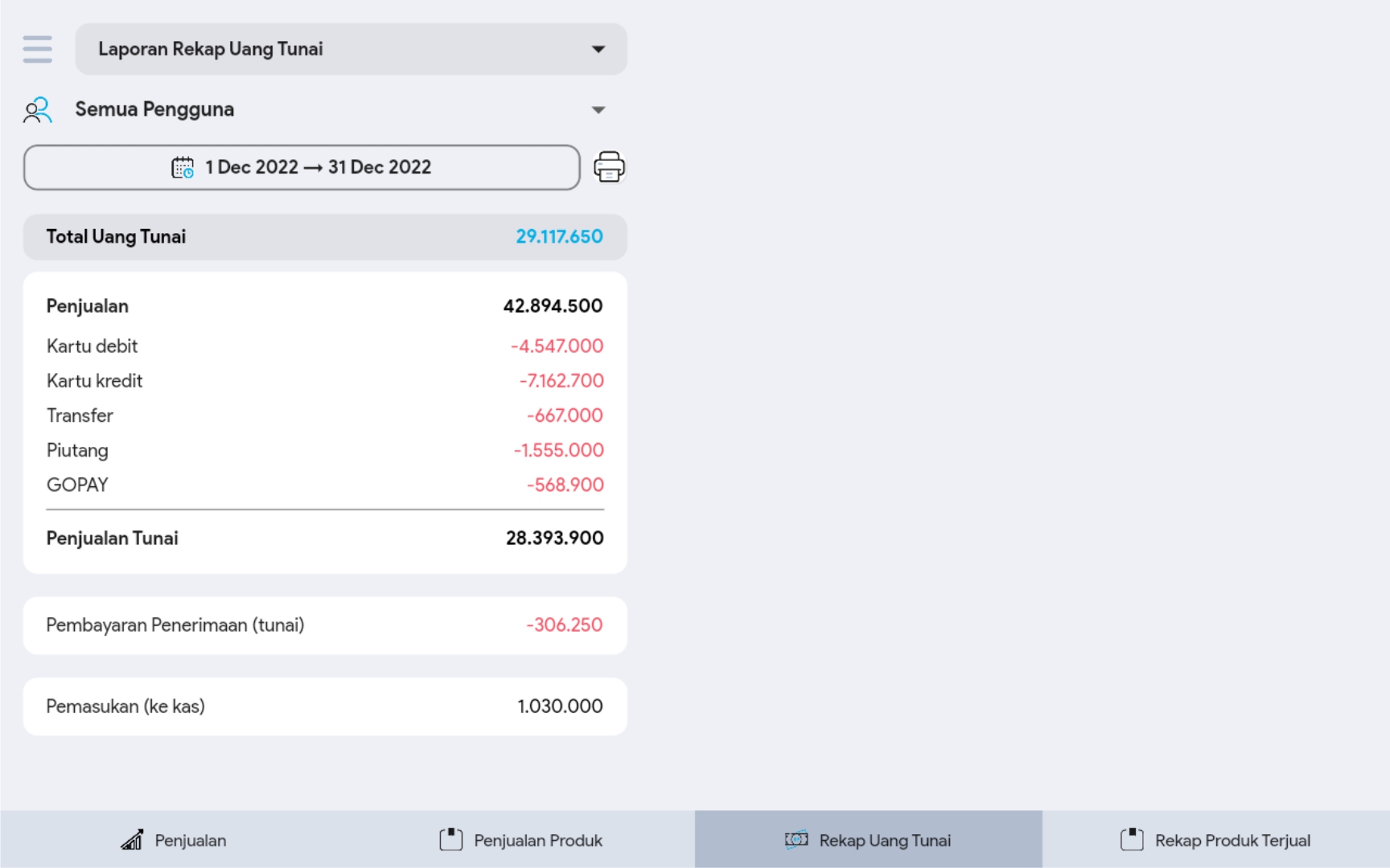 4. Sistem akan menyajikan total uang tunai yang Anda miliki dan jenis-jenis pembayaran yang diterima beserta jumlah nominalnya.