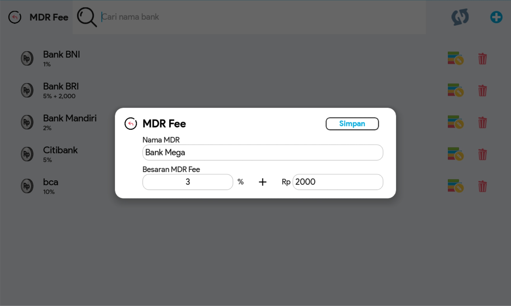 Penambahan Besaran MDR Fee dilakukan saat mencatatkan transaksi Penjualan pada fasilitas Penjualan. Besaran MDR Fee dapat dibuat berbeda-beda untuk setiap bank. Berikut caranya: