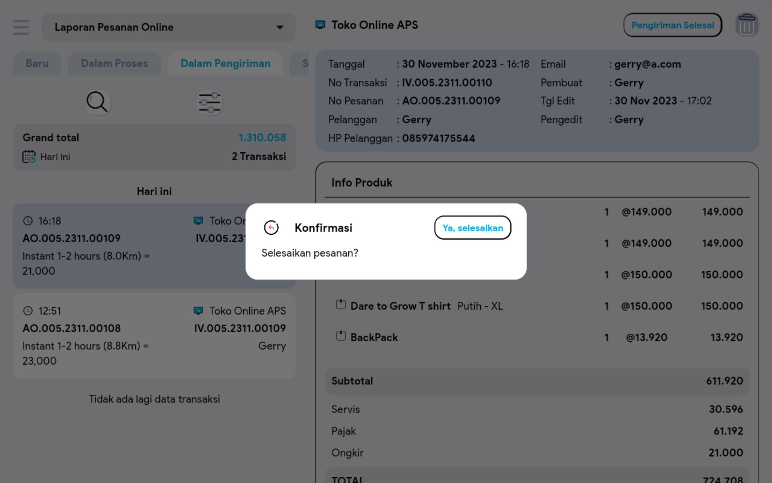 10. Sistem APS akan menampilkan pesanan online yang sedang dalam pengiriman