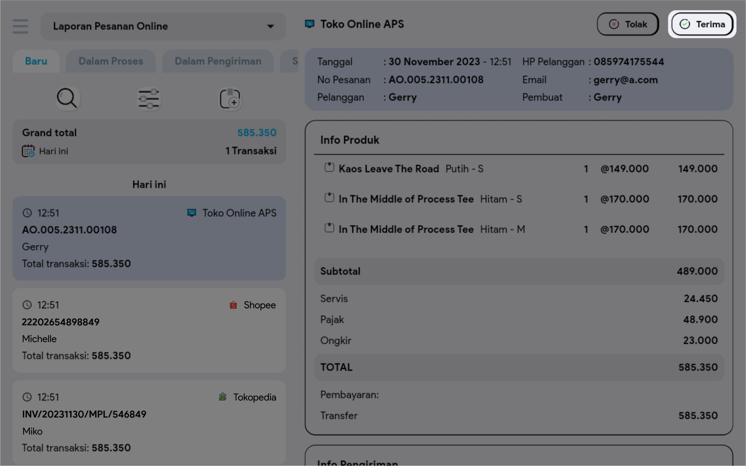 3. Klik Validasi Pembayaran (khusus toko online APS), dan Terima (untuk transaksi marketplace) untuk memproses pesanan.
