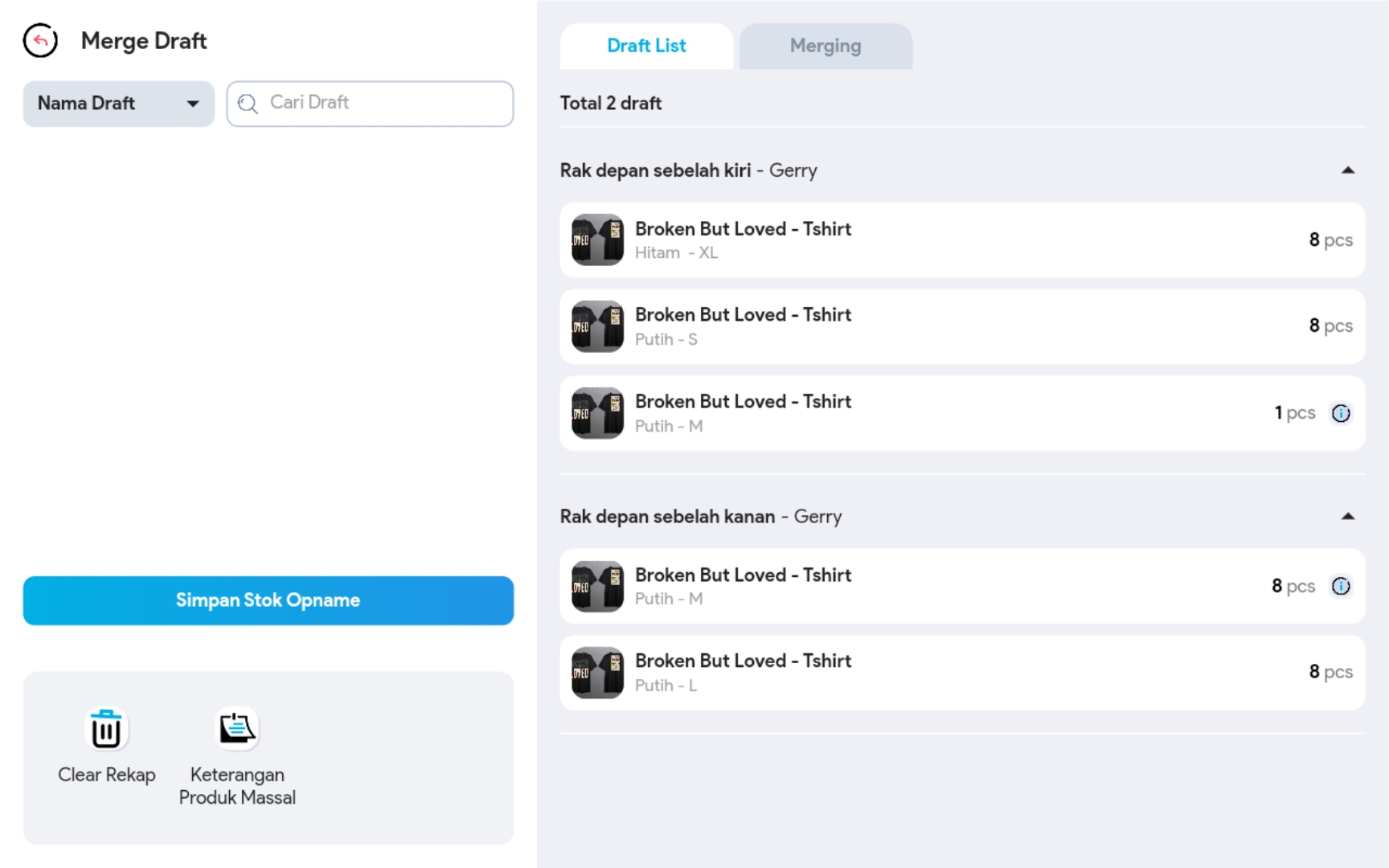 9. Pada tabulasi Merging ditampilkan total stok (stok lama & stok baru) yang telah diinput dari semua draft yang sudah dipilih.