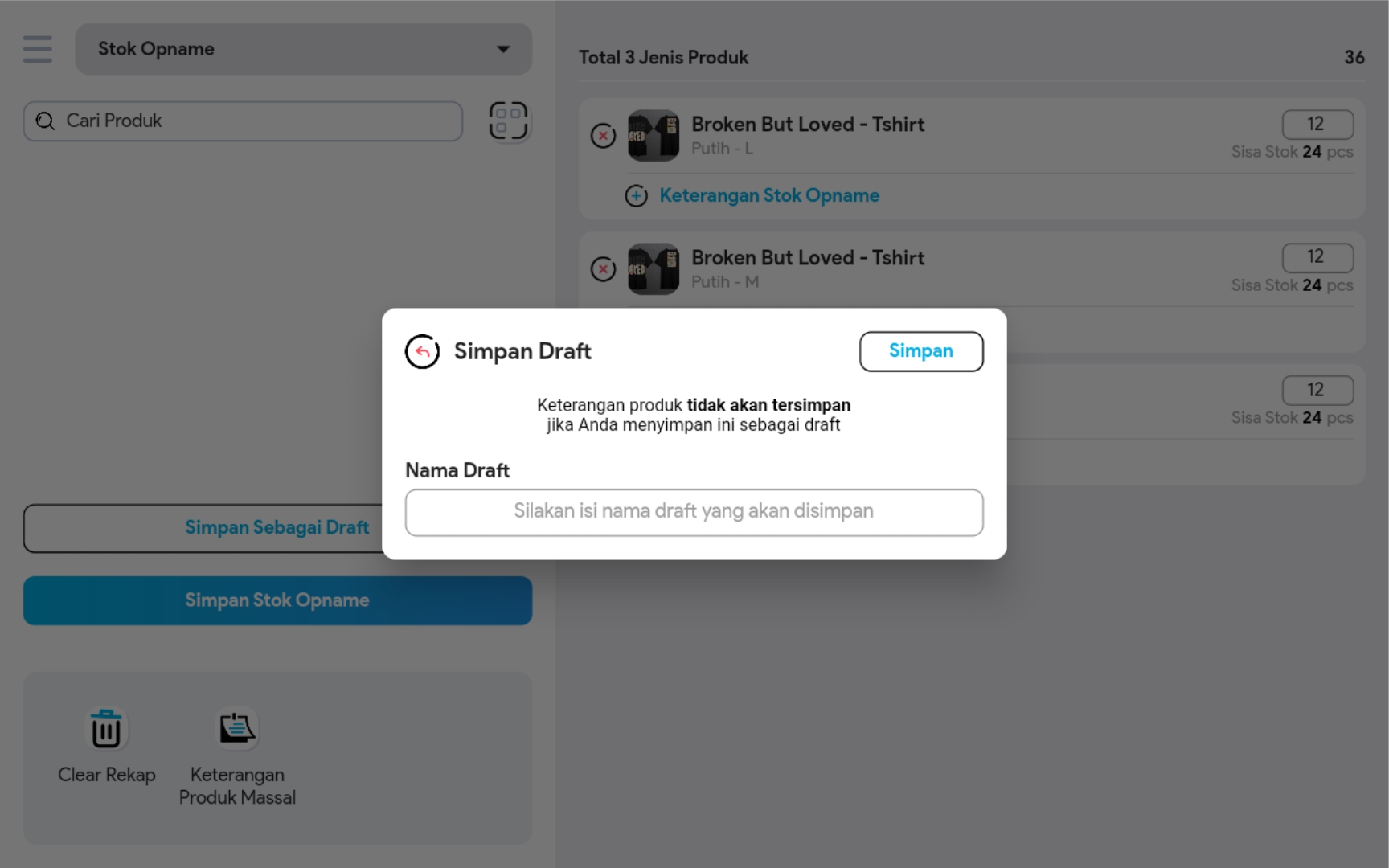 Atau scan produk (klik icon scan produk) yang akan dihitung stoknya