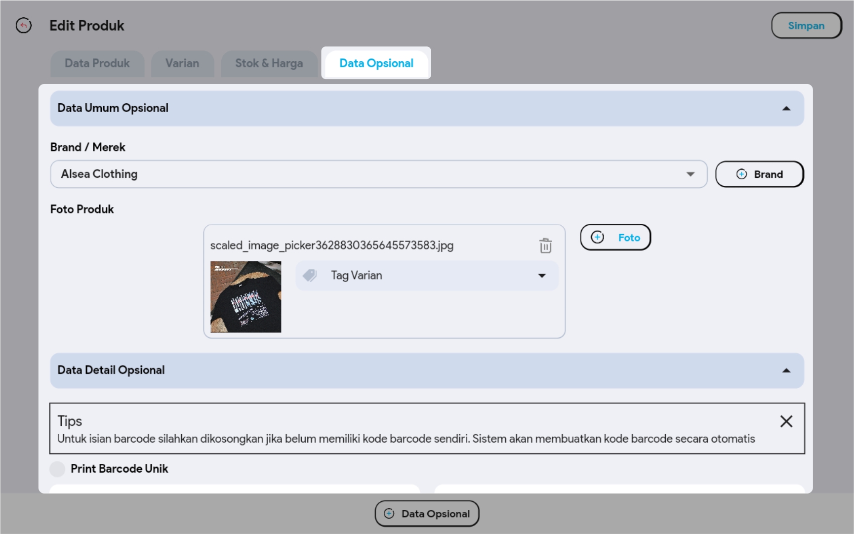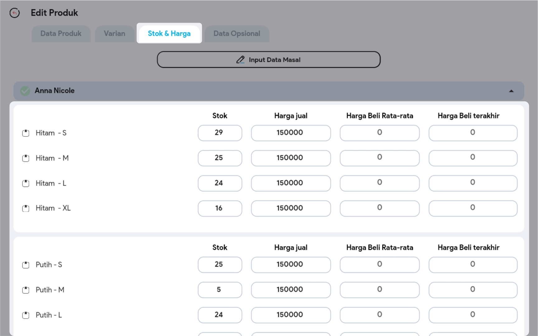 5. Lakukan perubahan data sesuai kebutuhan pada Tabulasi Data Produk, Varian, Stok & Harga, dll.
