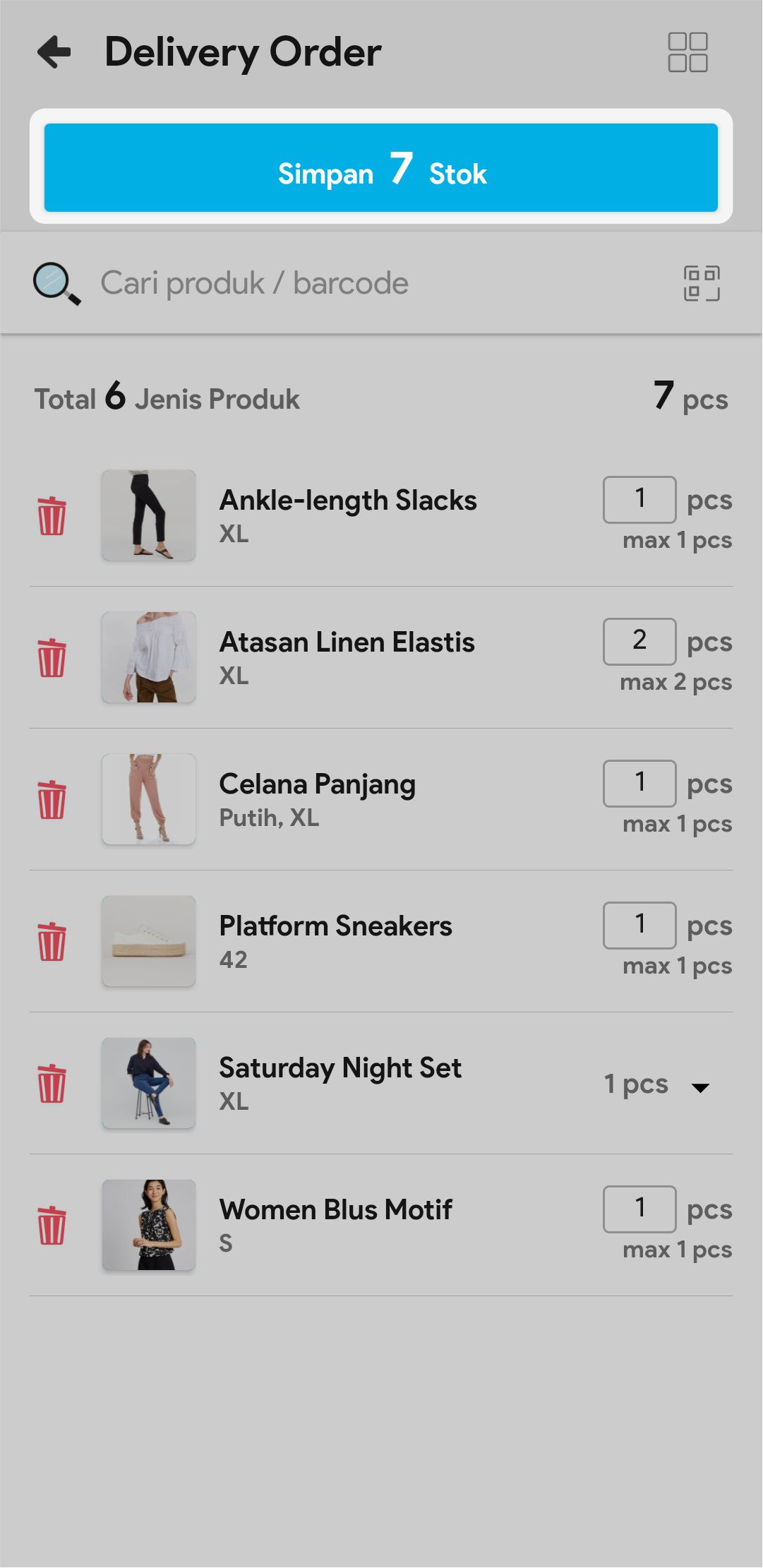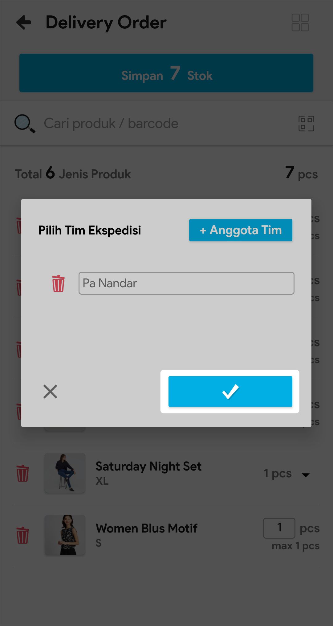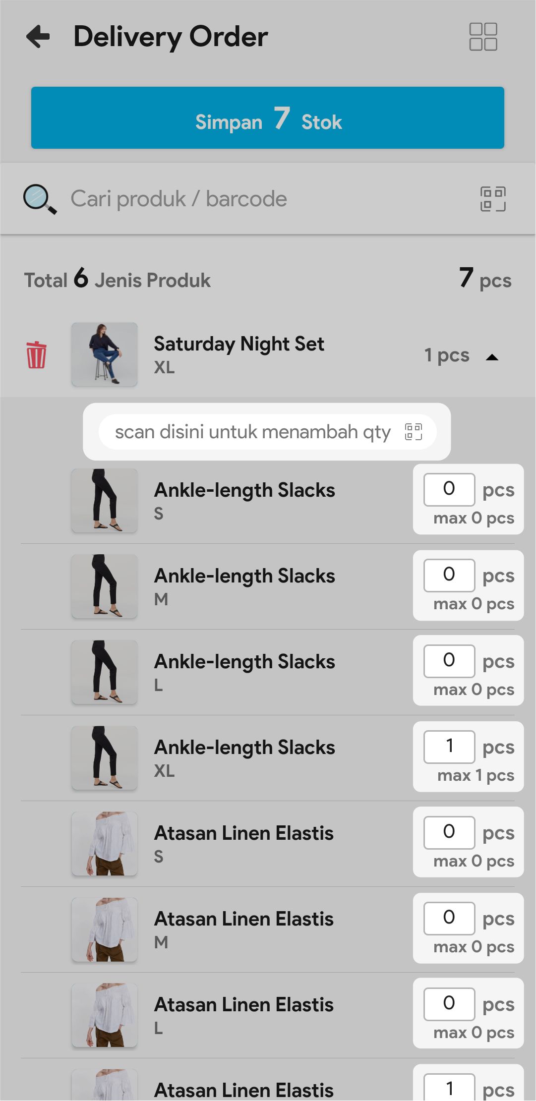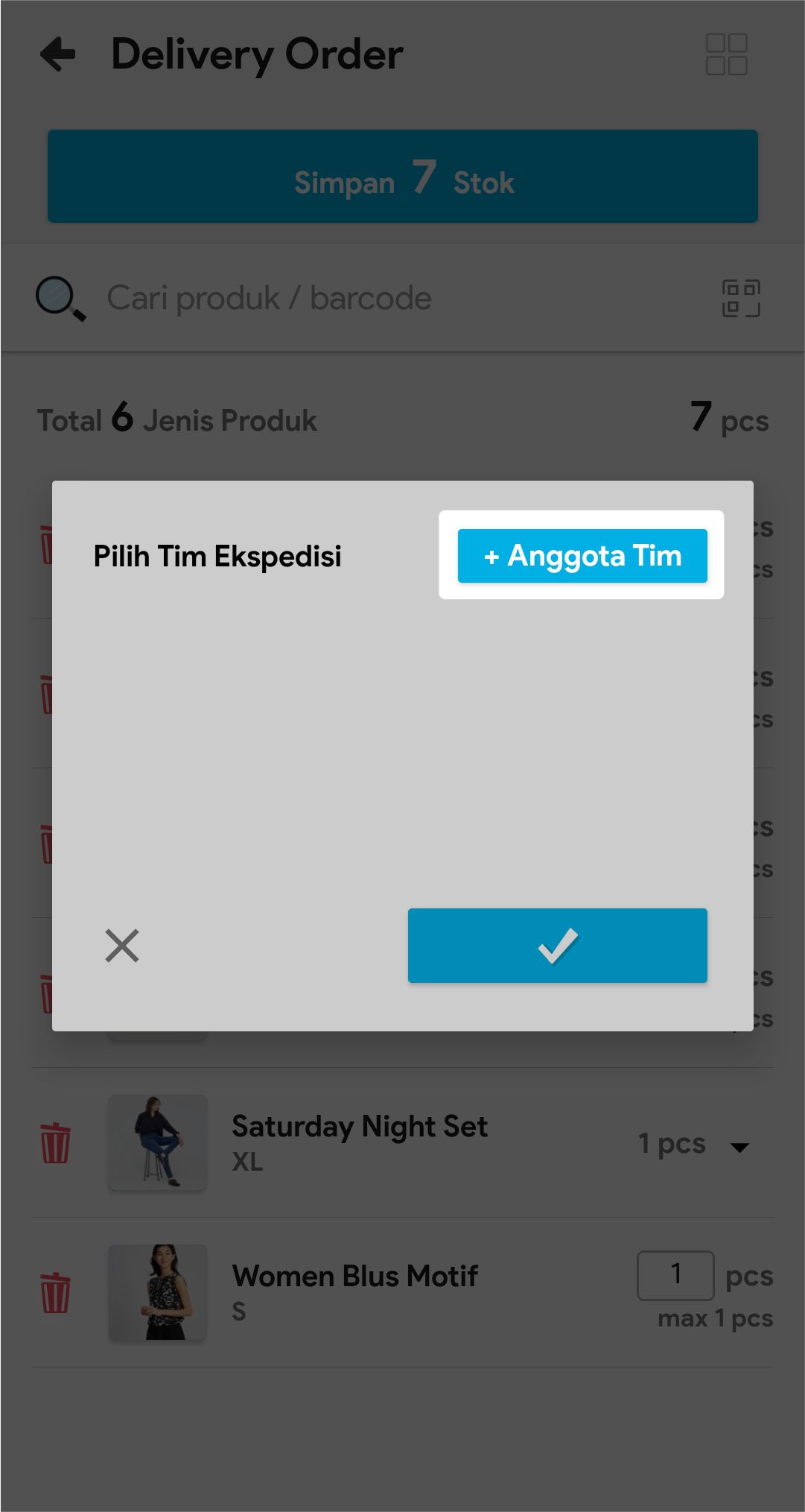 7. Masukkan jumlah stok yang akan dikirim atau scan barcode produk untuk menambah stok yang akan dikirim.