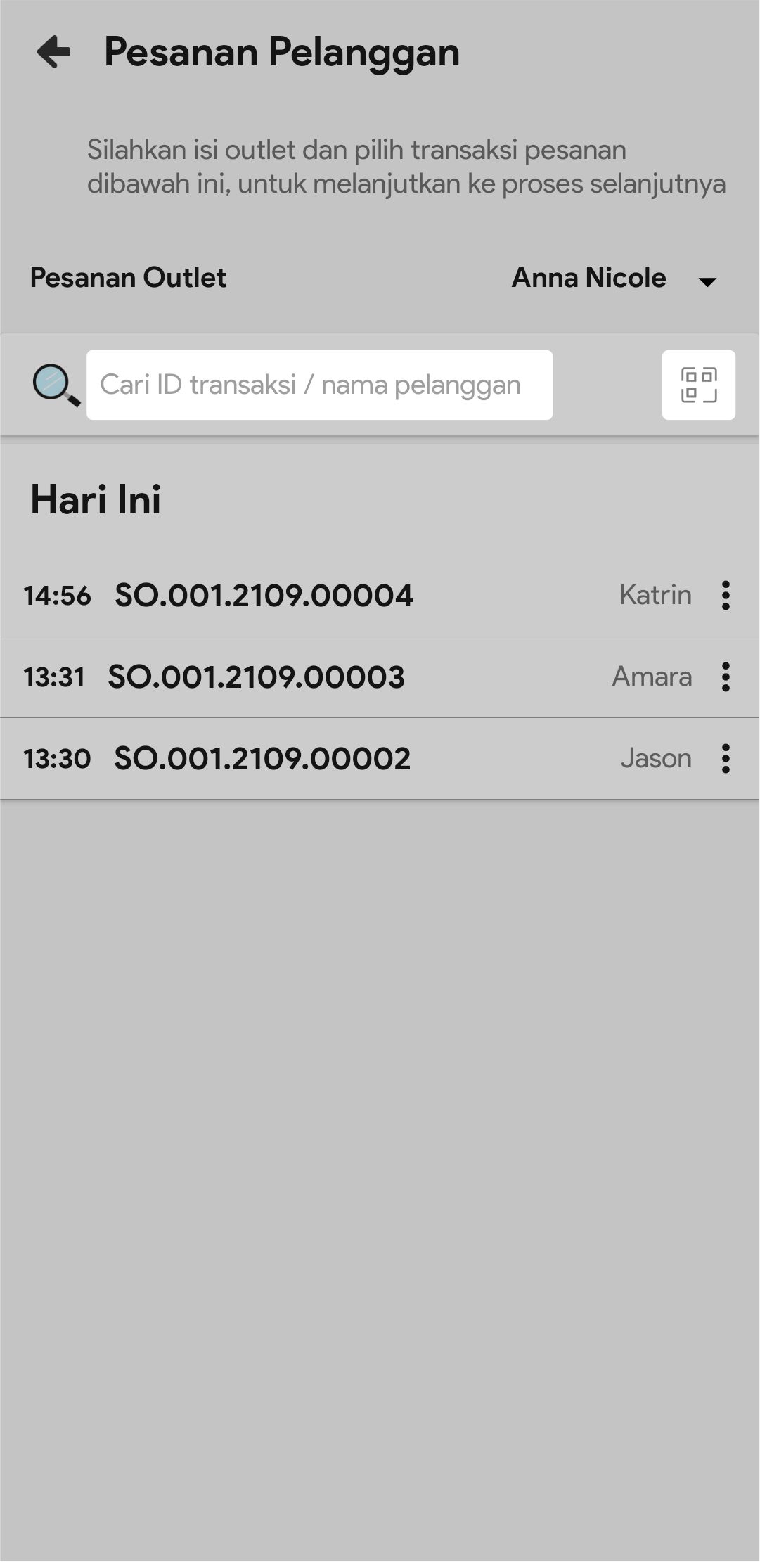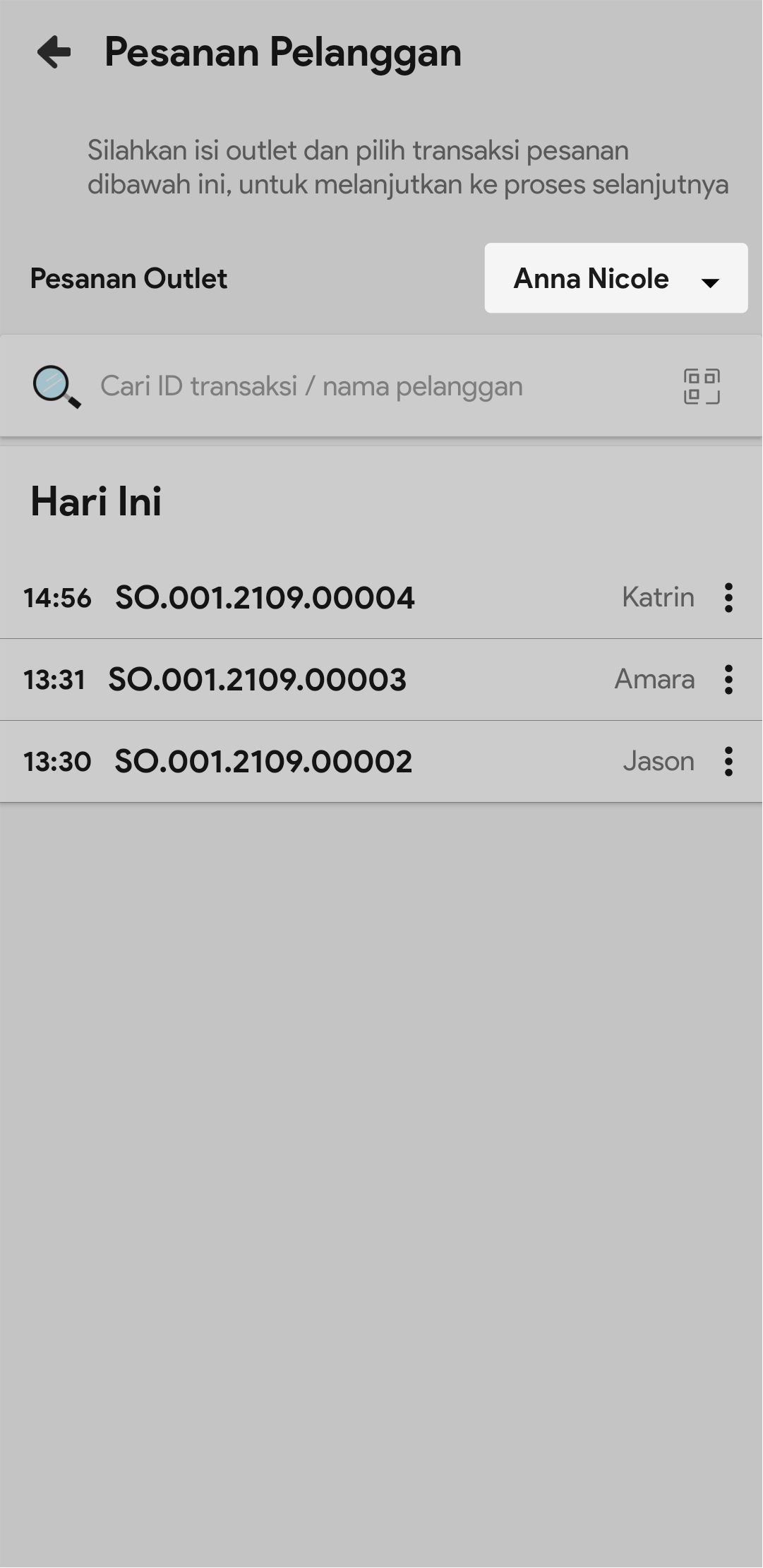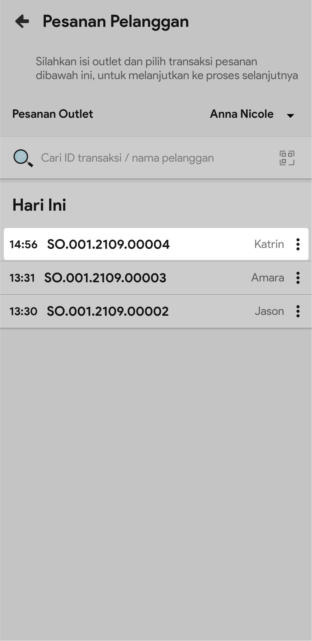 5. Di kolom pencarian, masukkan nomor ID transaksi/Nama pelanggan dari transaksi pesanan yang akan di buat delivery ordernya atau scan barcode pesanan yang akan di buat delivery ordernya.