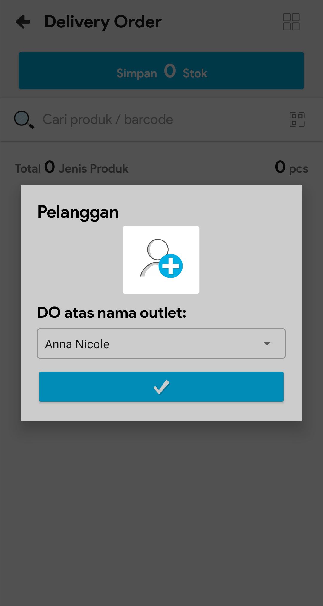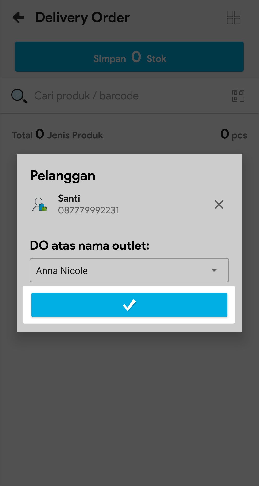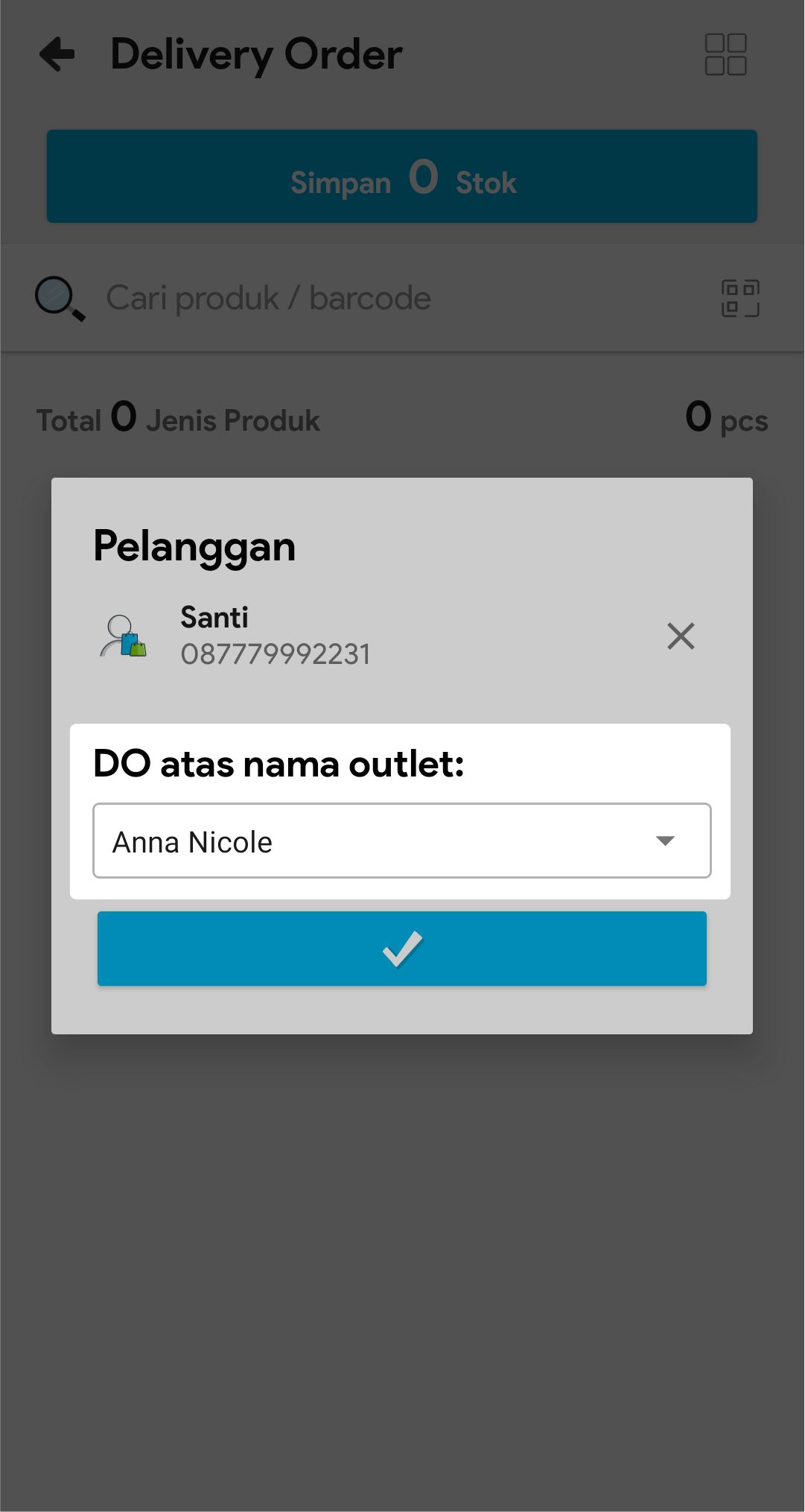 5. Pilih Outlet Tujuan delivery order dibuat, lalu klik V