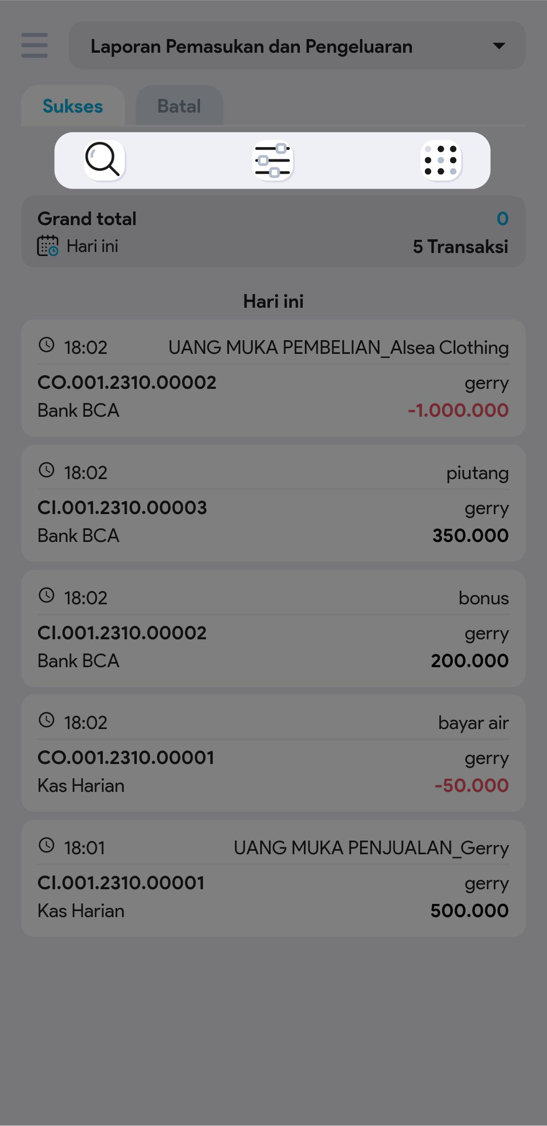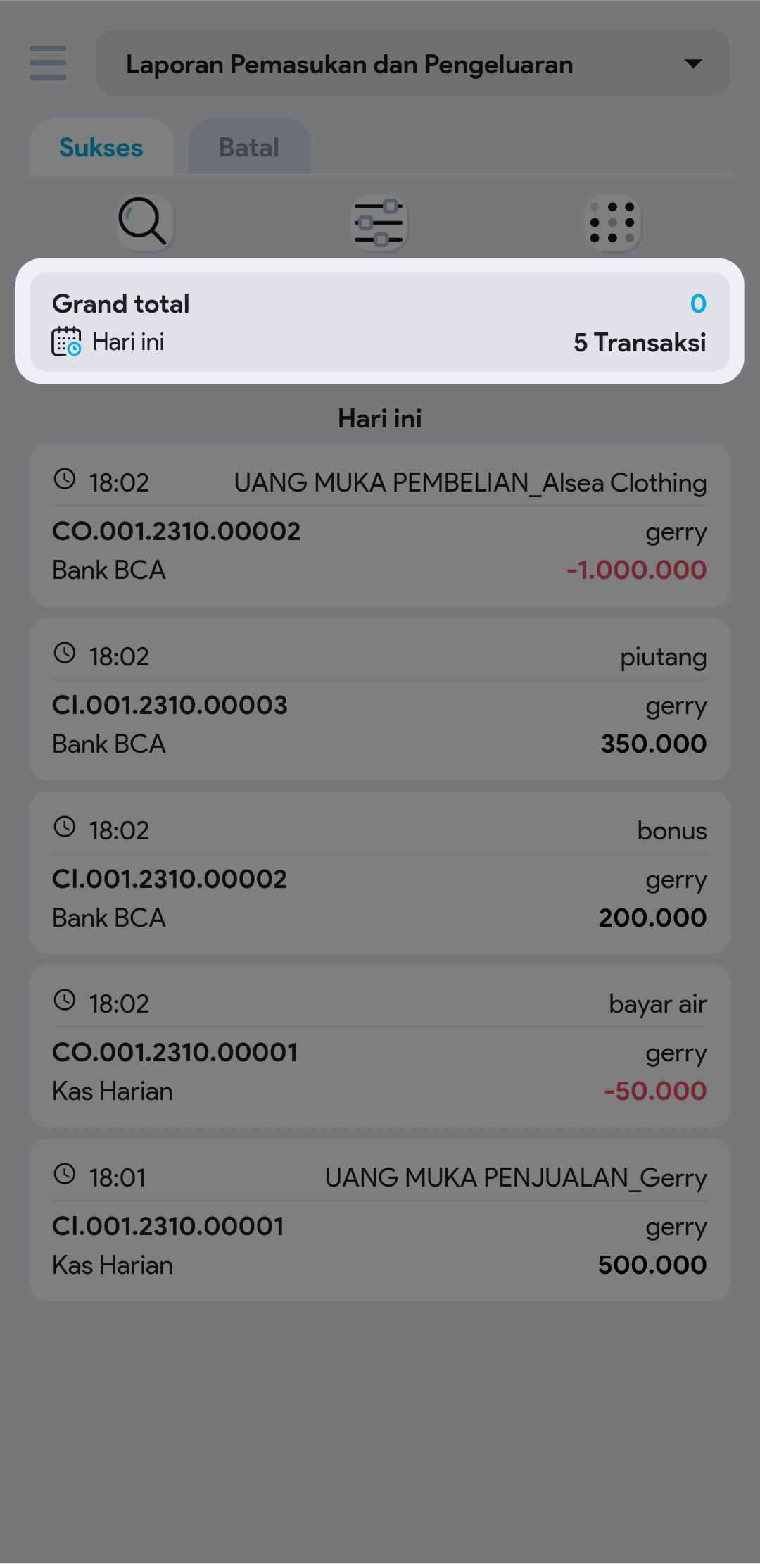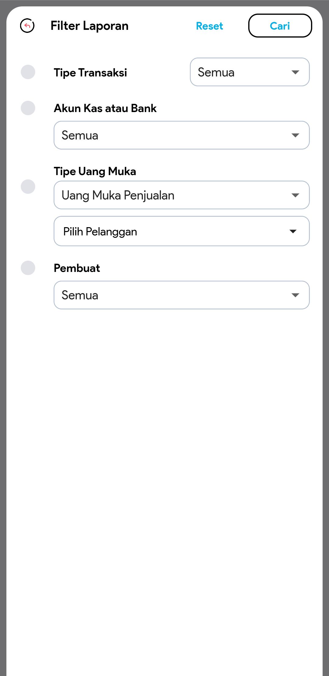 4. Untuk mencari transaksi tertentu, gunakan pembatasan filter jika diperlukan (tipe transaksi, akun kas atau bank, tipe uang muka, pembuat, no. pemasukan pengeluaran)