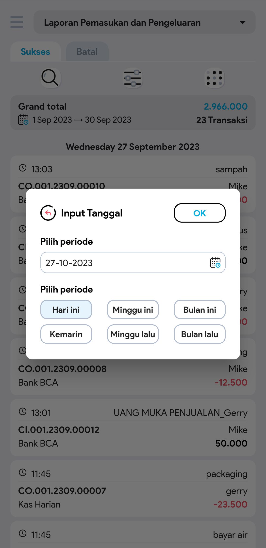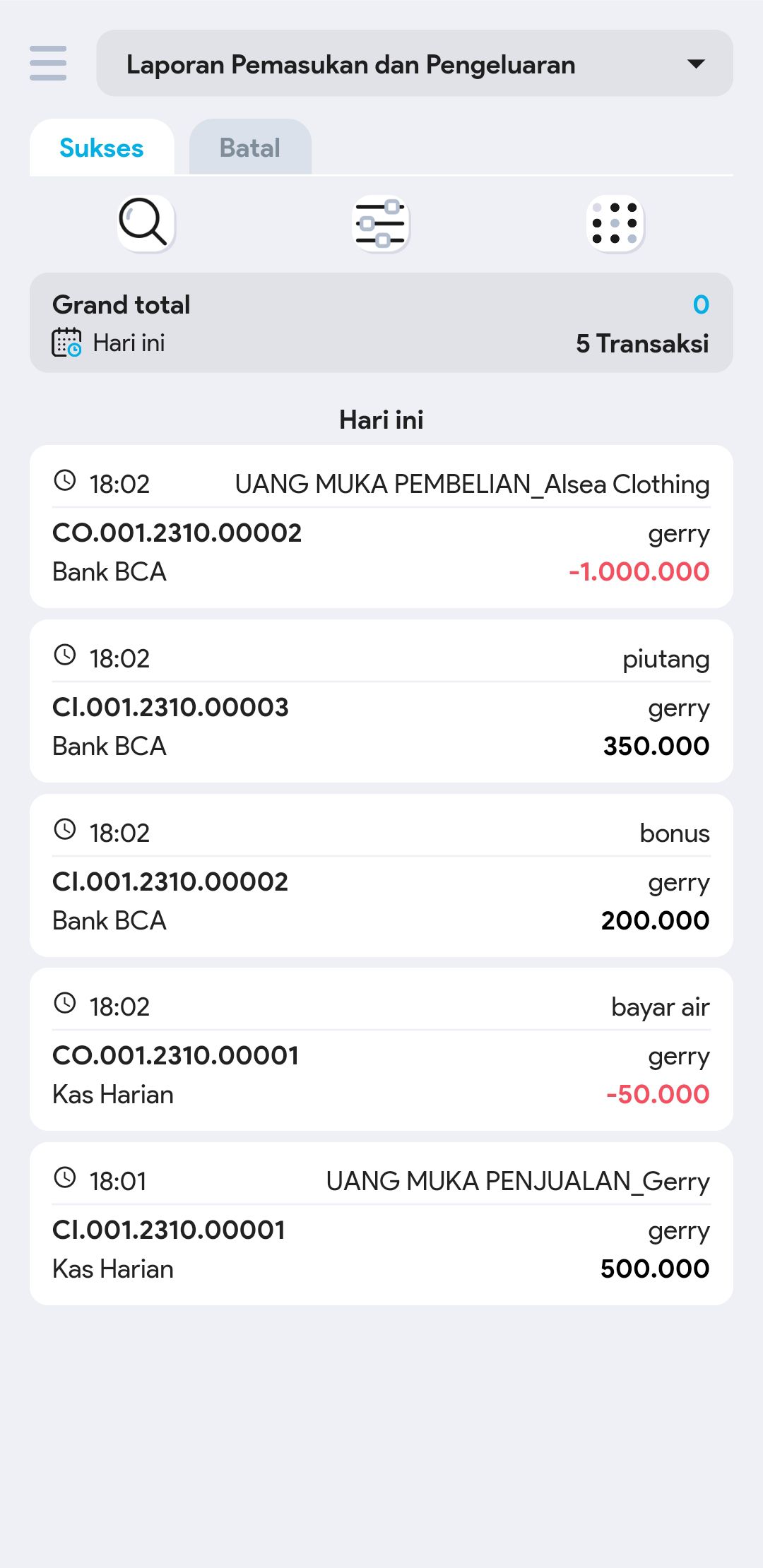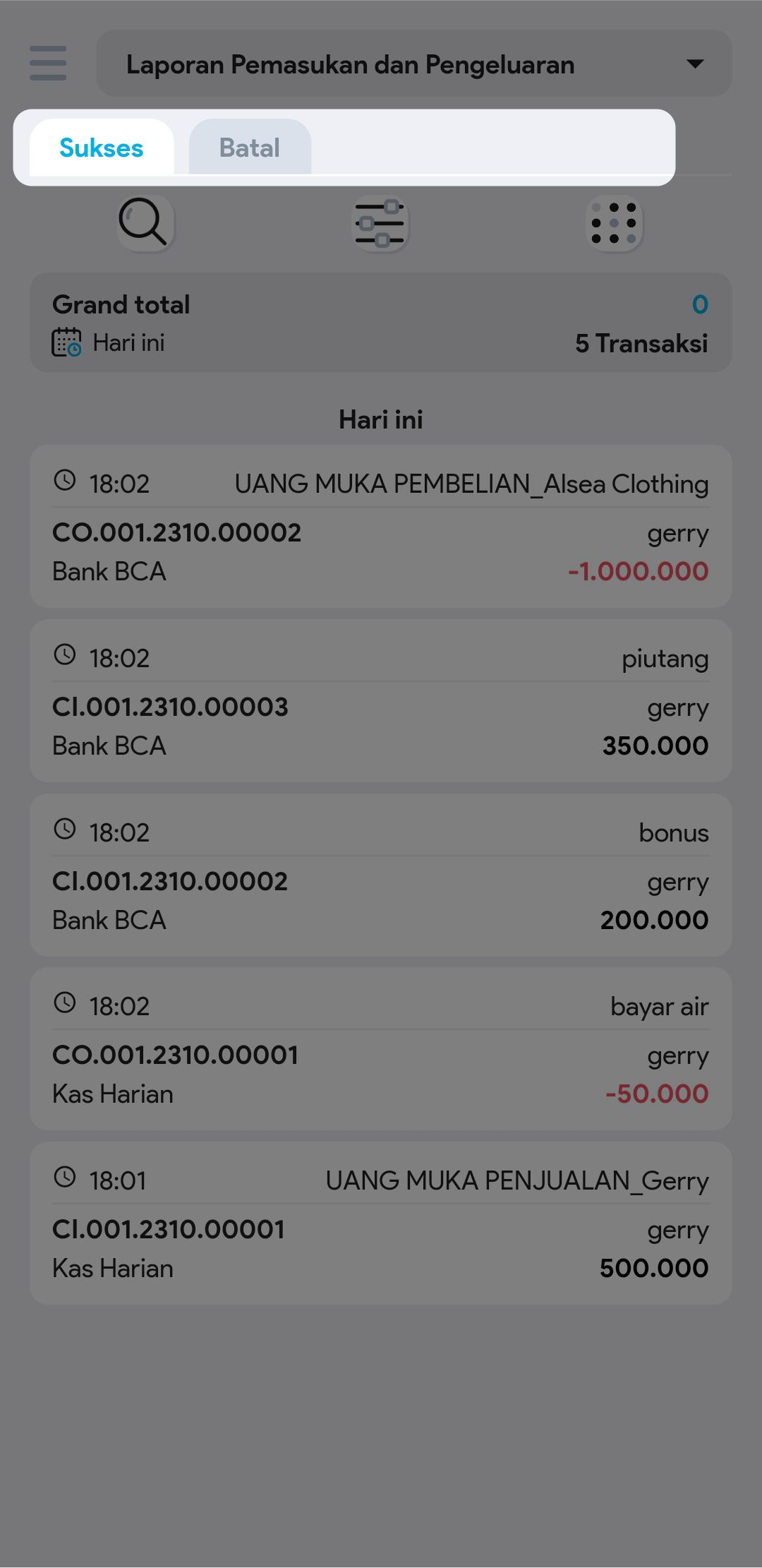 4. Untuk mencari transaksi tertentu, gunakan pembatasan filter jika diperlukan (tipe transaksi, akun kas atau bank, tipe uang muka, pembuat, no. pemasukan pengeluaran)