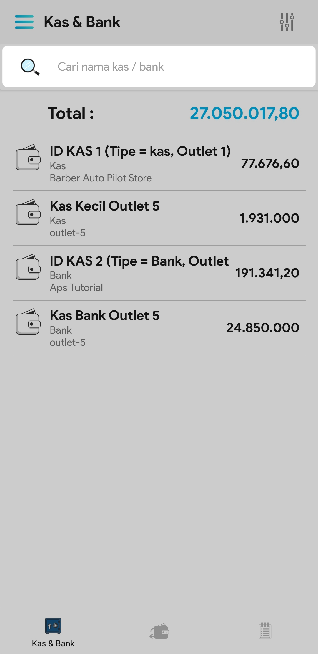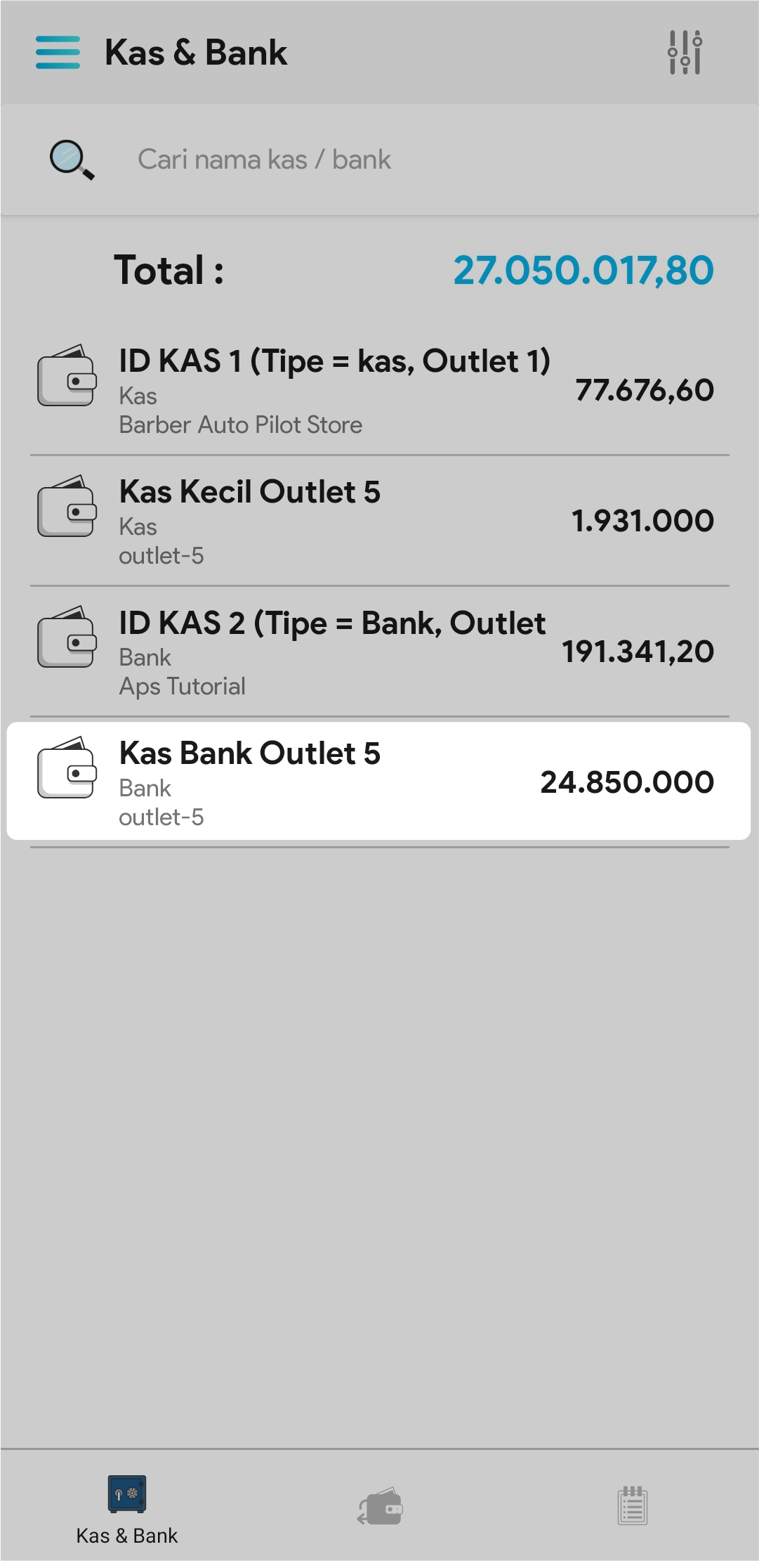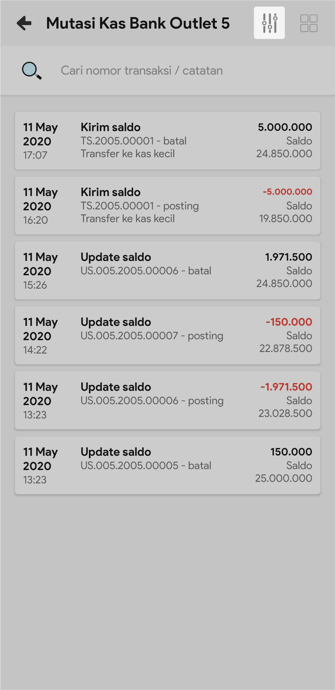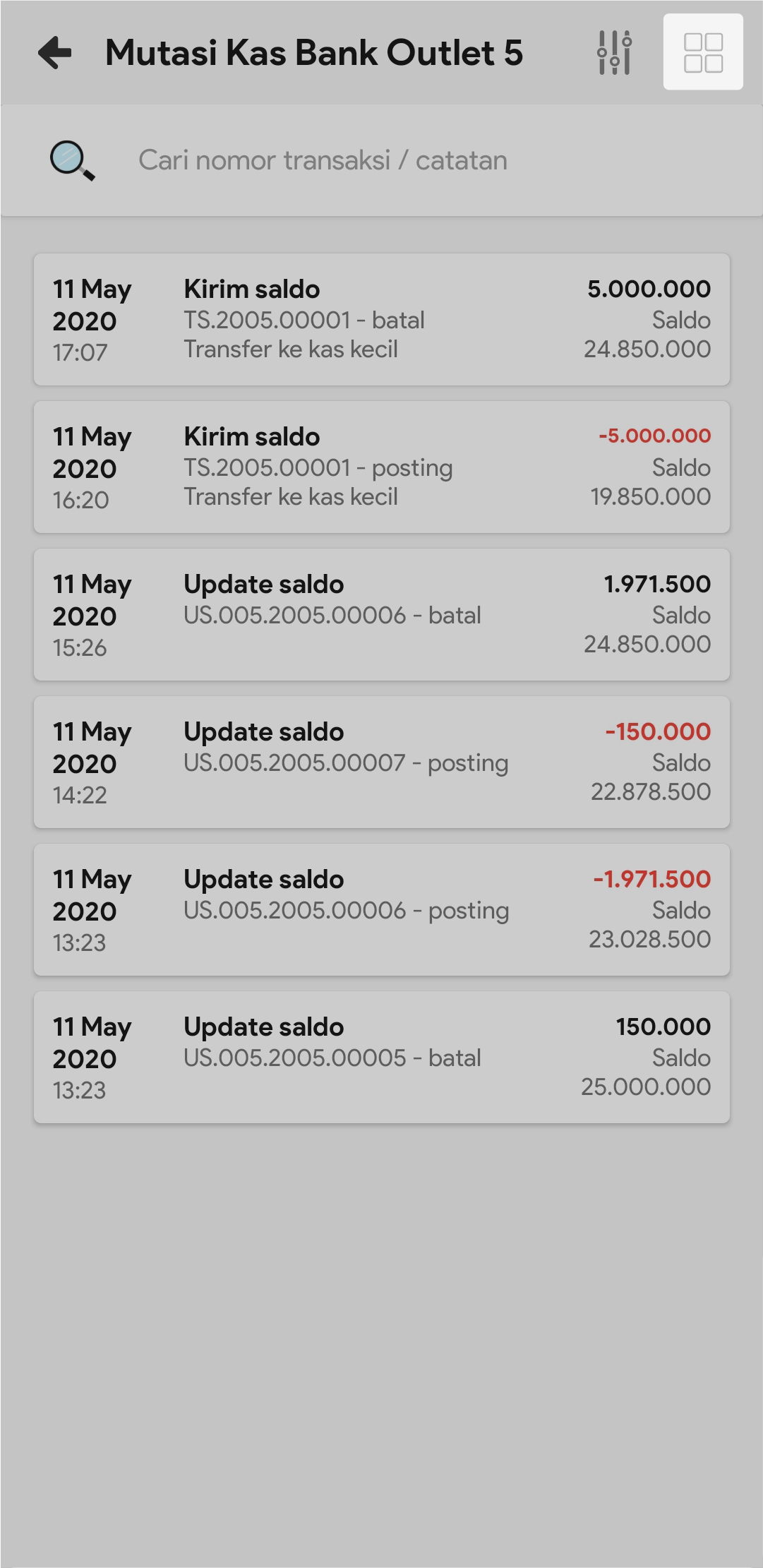2. Cari akun kas/bank yang akan dilihat mutasi nya pada kolom pencarian