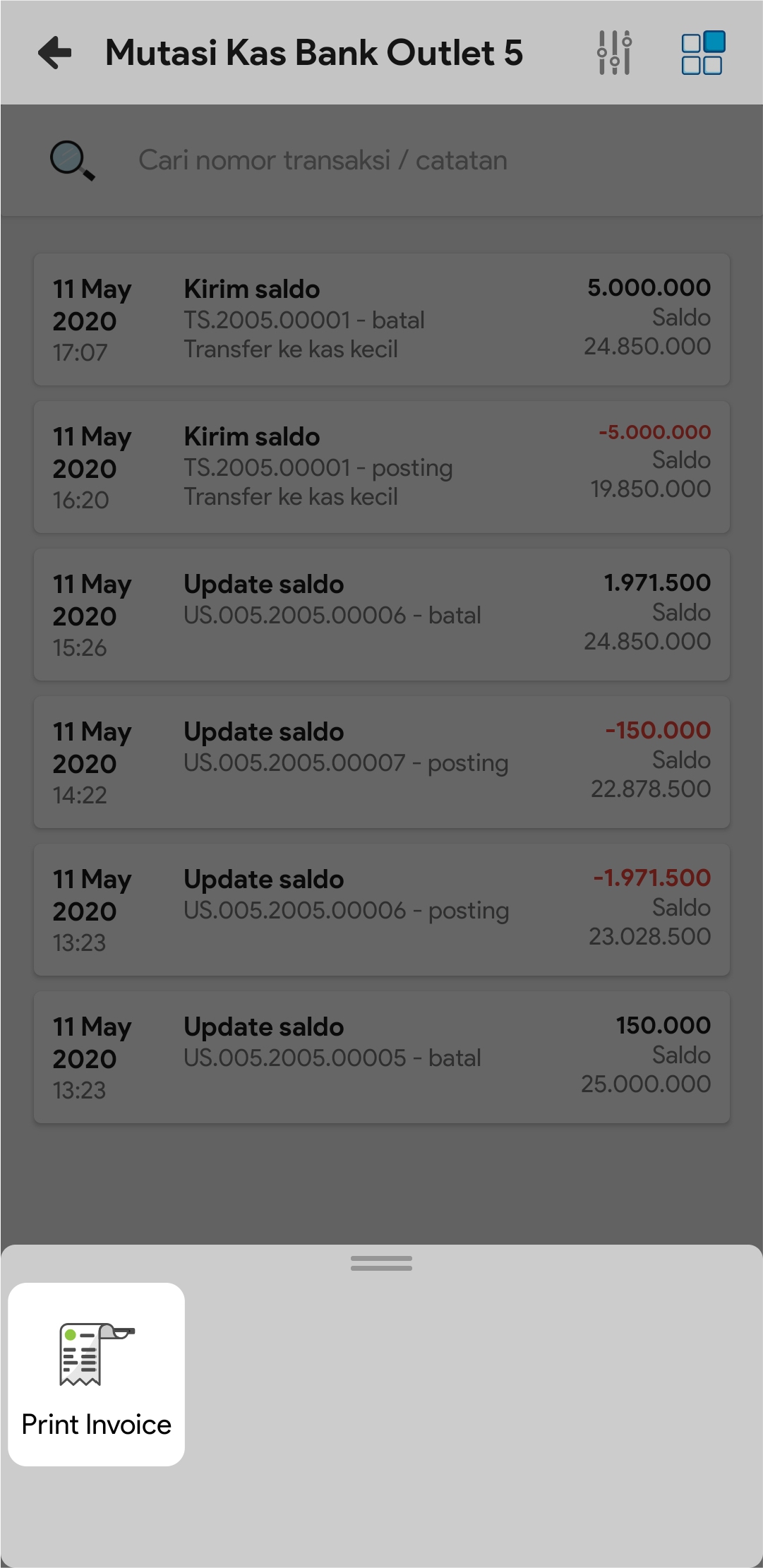 7. Pilih Print Invoice untuk mencetak mutasi akun kas/bank