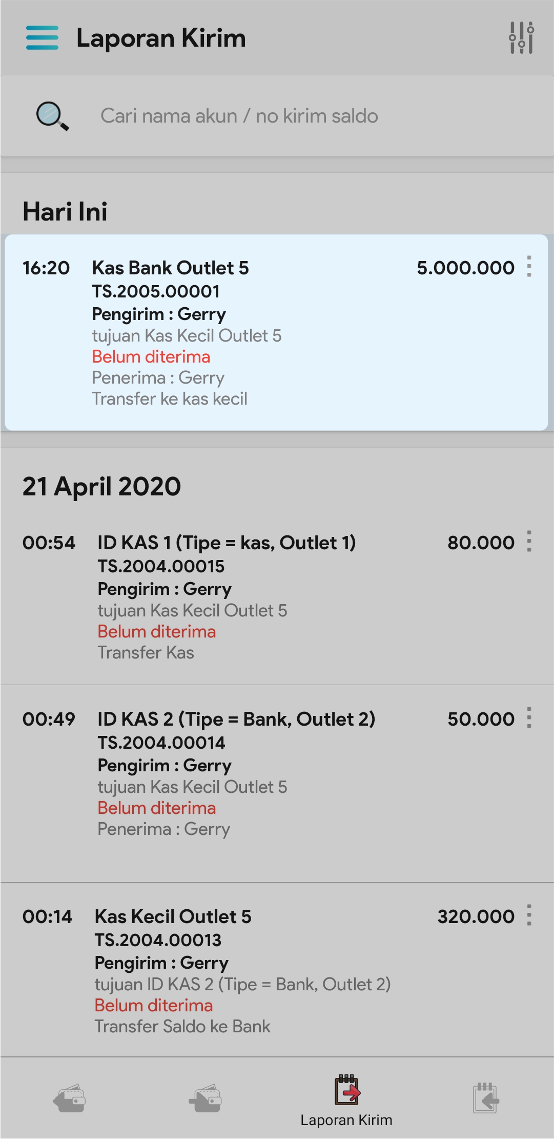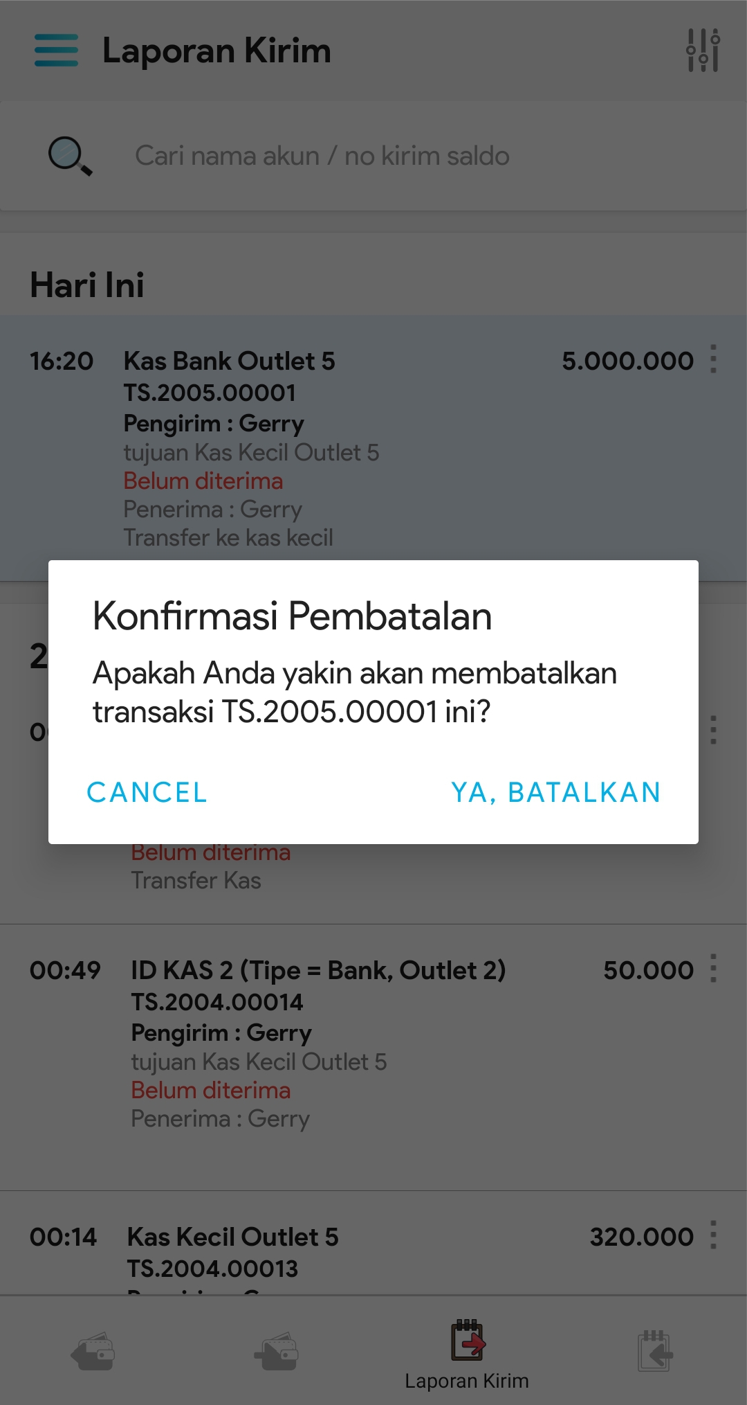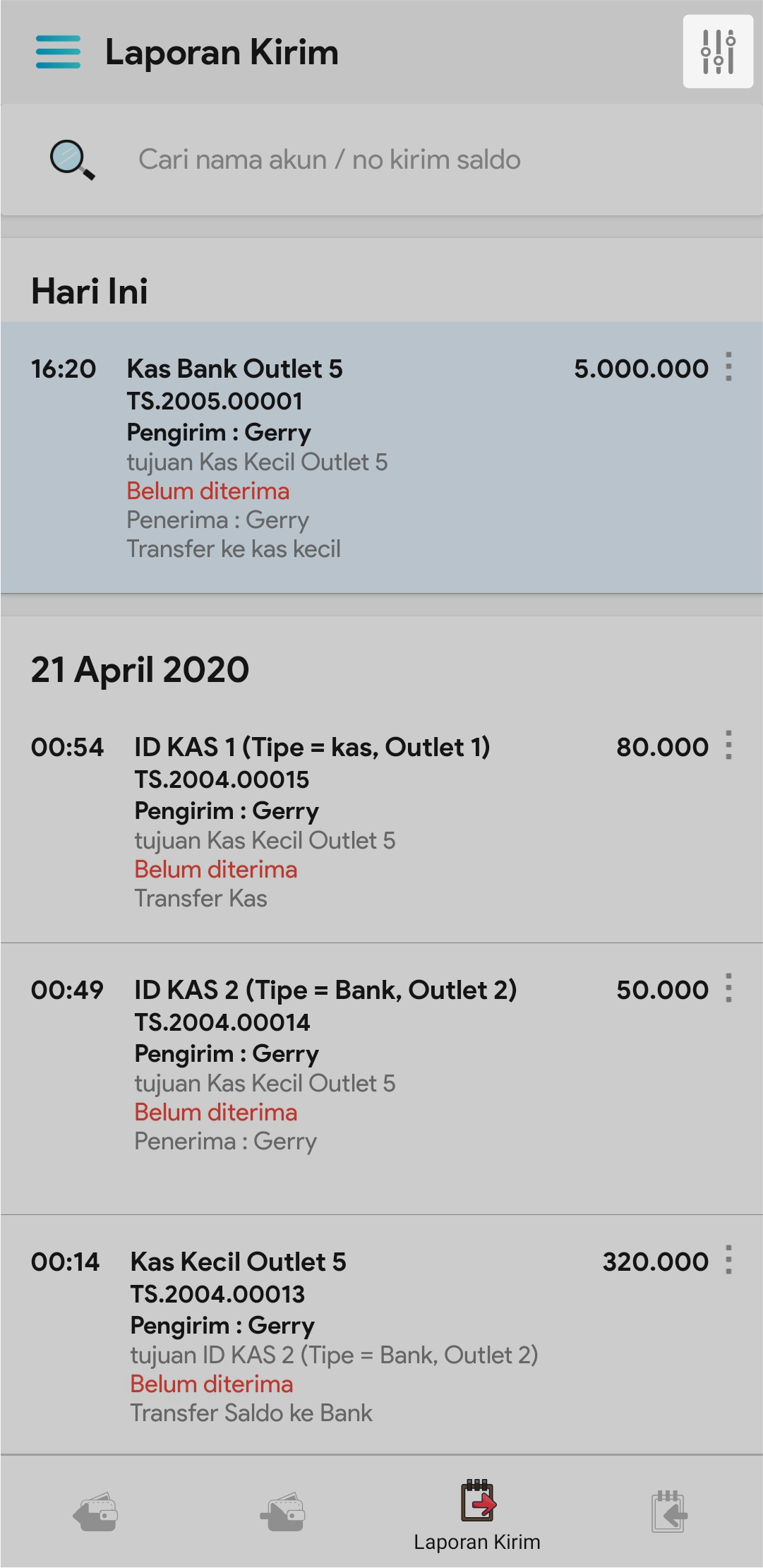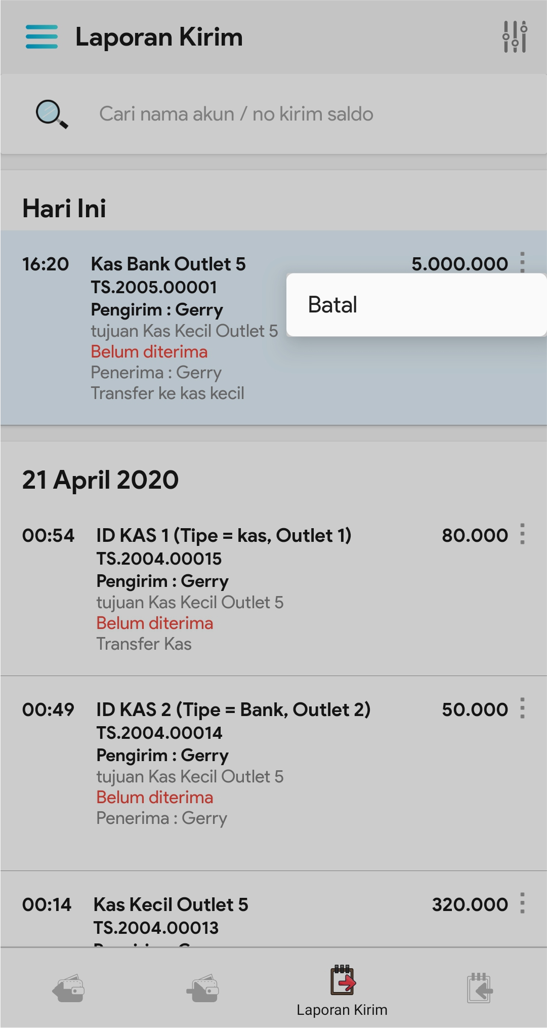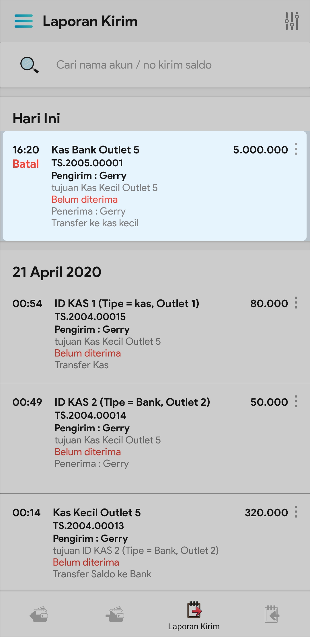 2. Cari Pengiriman saldo yang ingin dibatalkan. Gunakan filter untuk mempermudah pencarian