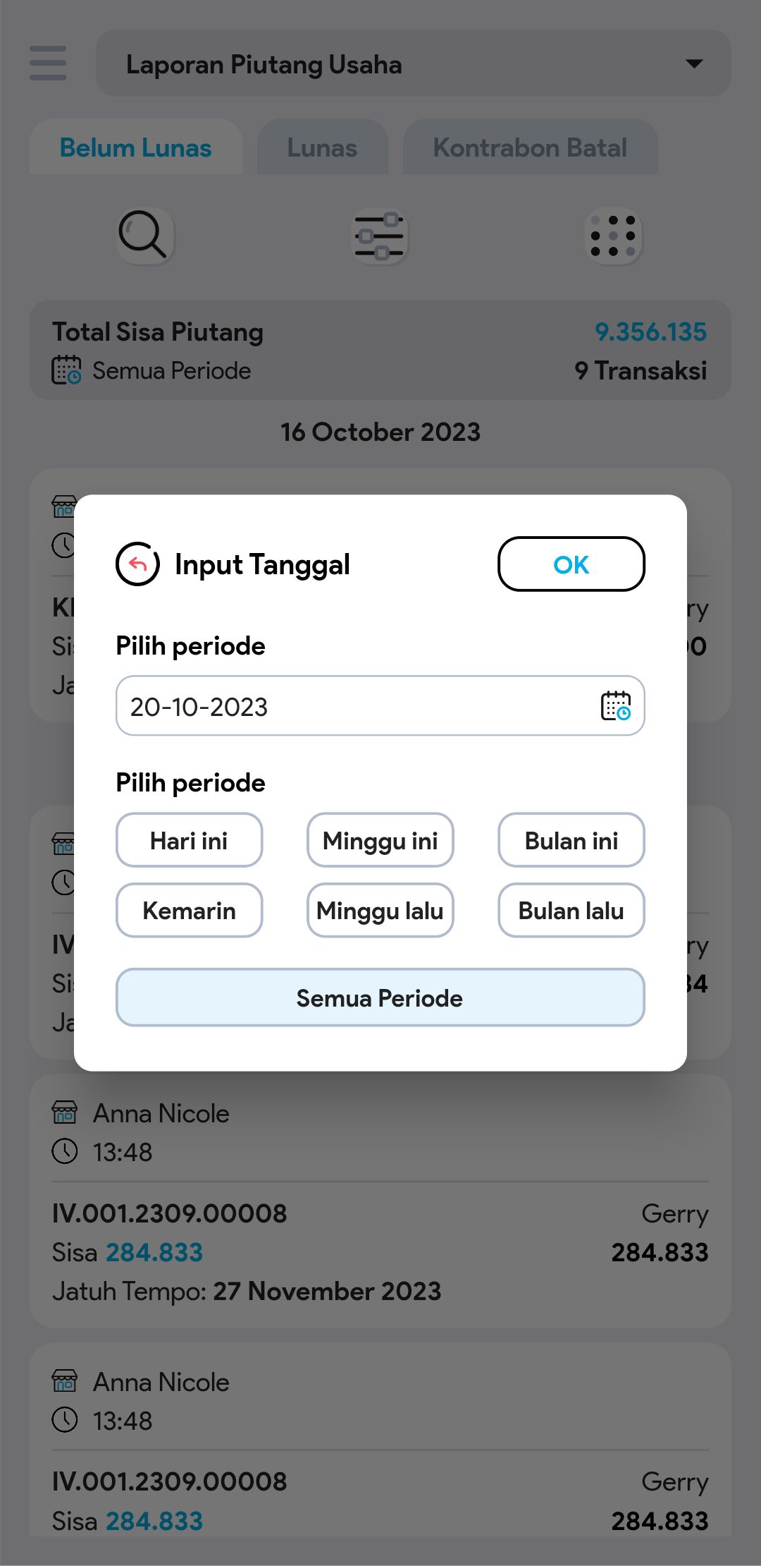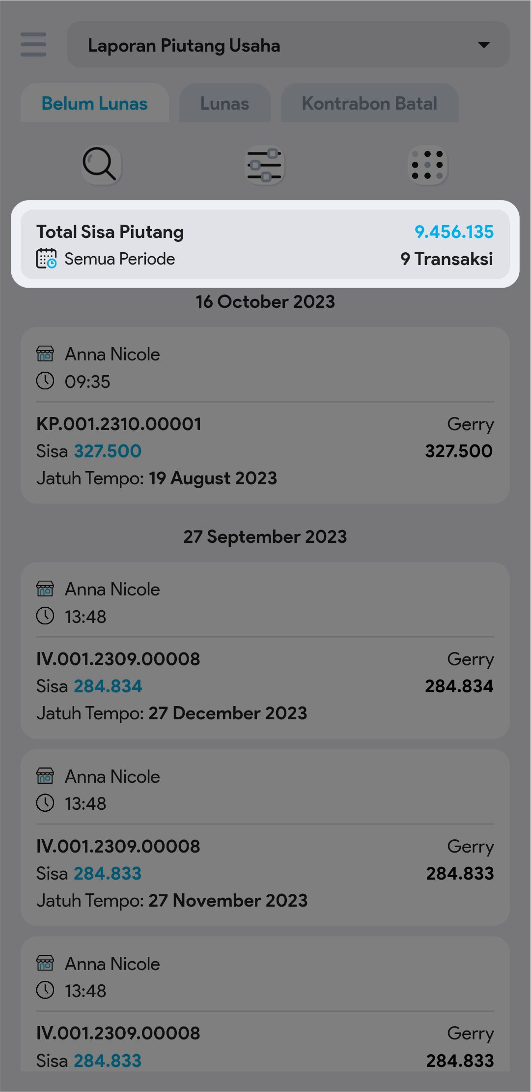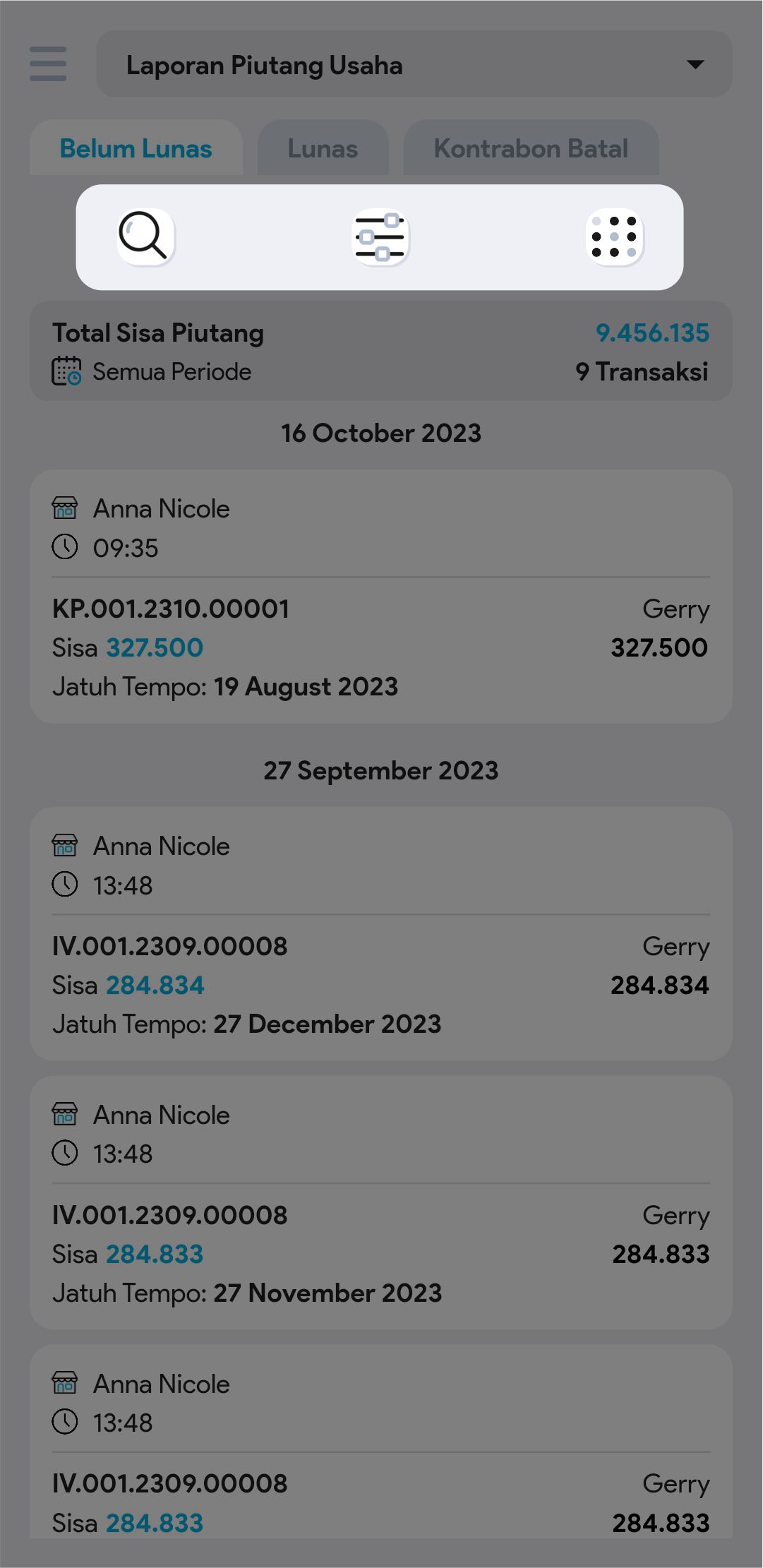 6. Cari dan pilih transaksi piutang yang diinginkan untuk melihat informasi lebih detail