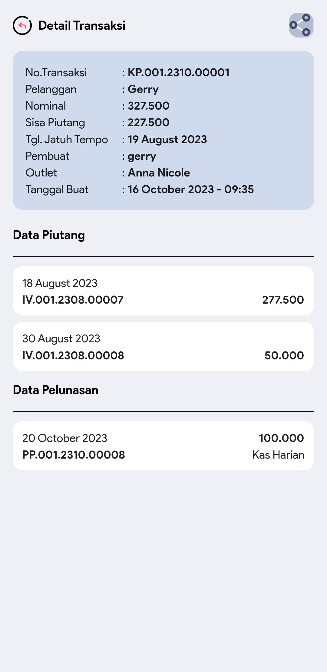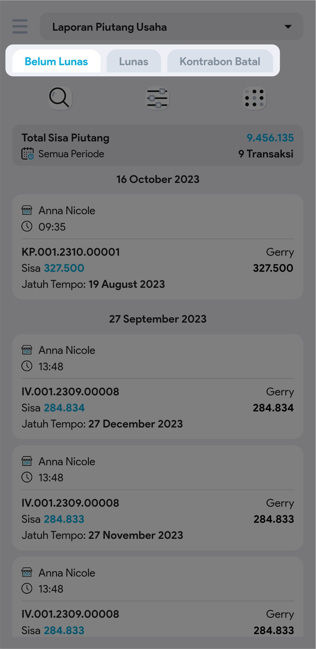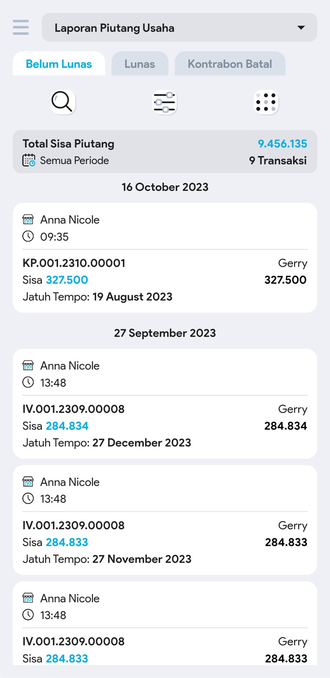 6. Cari dan pilih transaksi piutang yang diinginkan untuk melihat informasi lebih detail