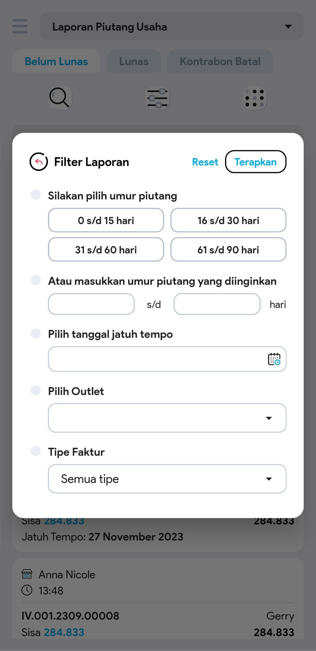 4. Untuk mencari transaksi tertentu, gunakan pembatasan filter jika diperlukan (tanggal jatuh tempo, umur piutang, pelanggan, outlet, no invoice / kontrabon)
