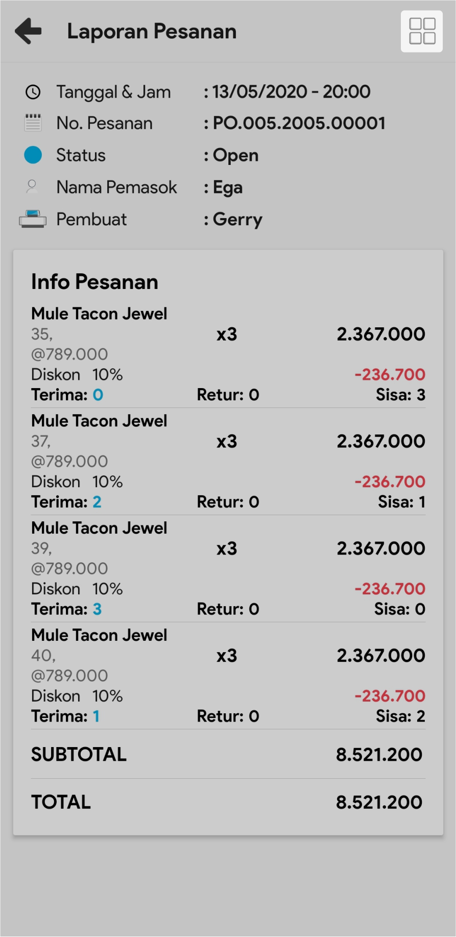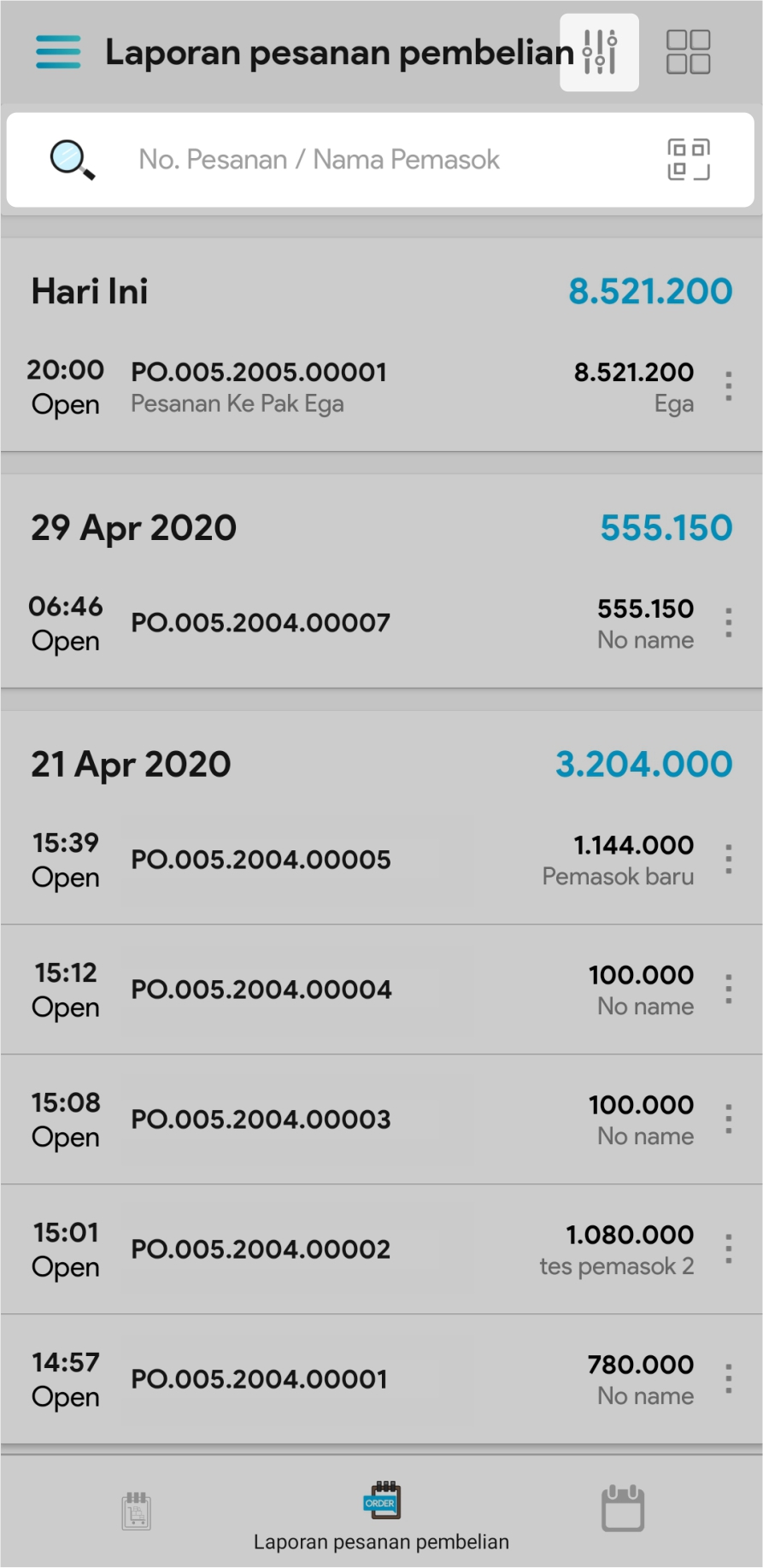 2. Masukkan nama pemasok atau no pesanan pada kolom pencarian