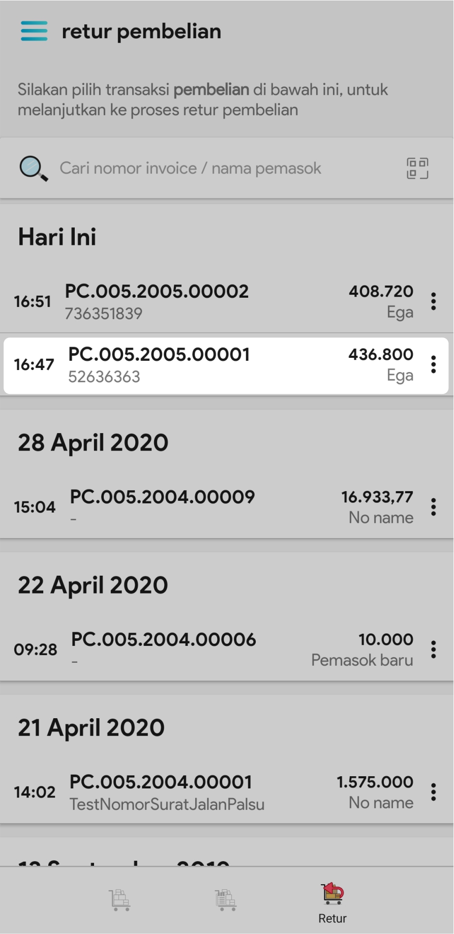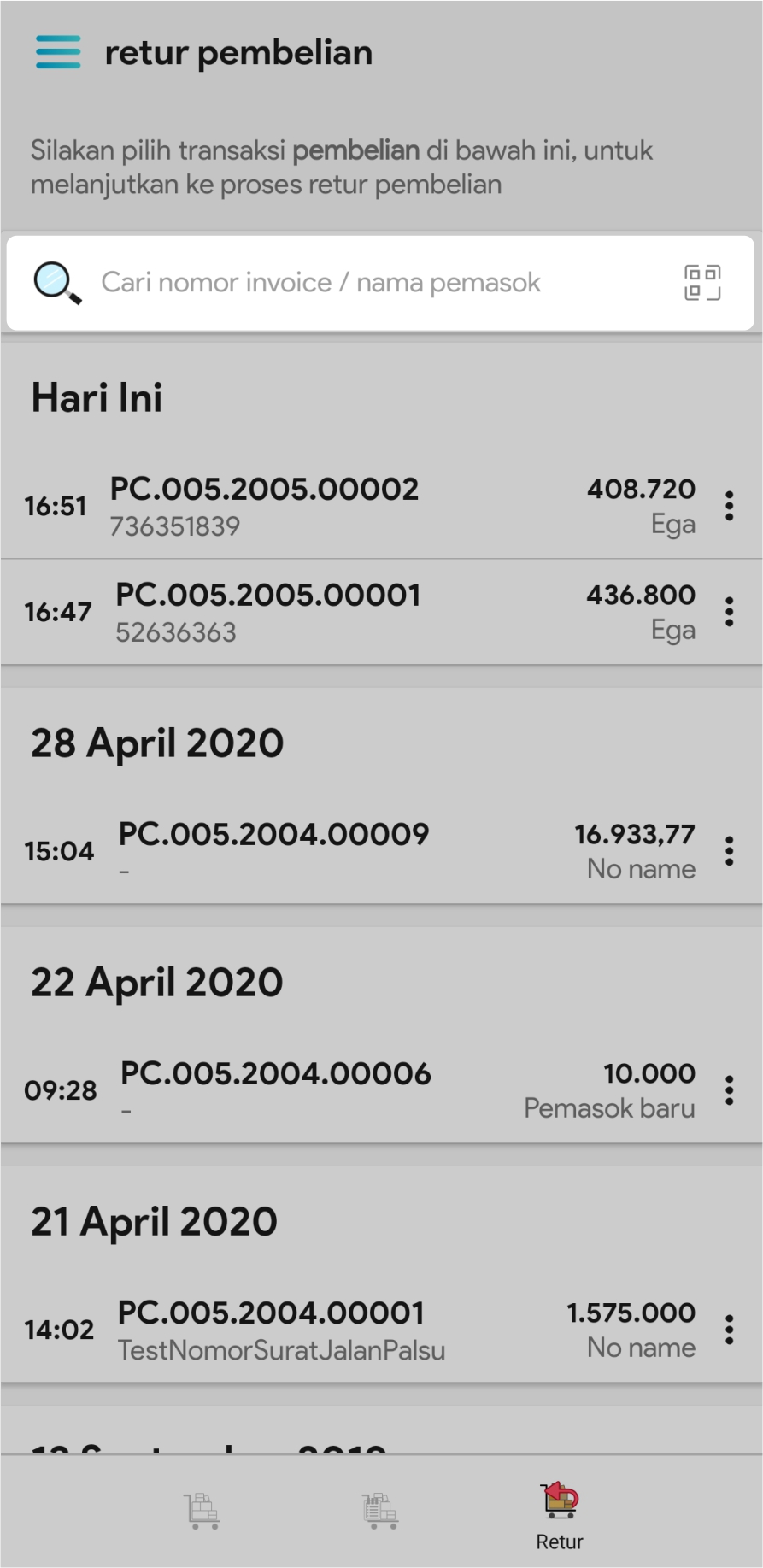 2. Di kolom pencarian, masukkan nomor invoice penerimaan / nama pemasok dari transaksi penerimaan yang akan di retur